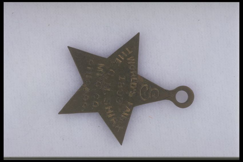 Star-shaped stamped metal pendant with inscription: "WORLD'S FAIR/ 1893" on one side and picture of chest on other side; ring on top.