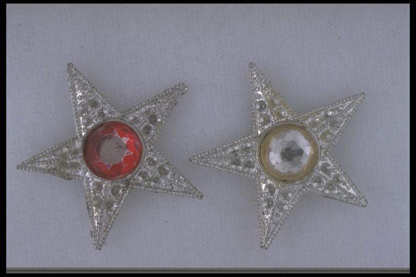 One of two star shaped buttons constructed from white metal cast with millegrain edges and faux marcasite settings. Center faceted paste gem colored red.