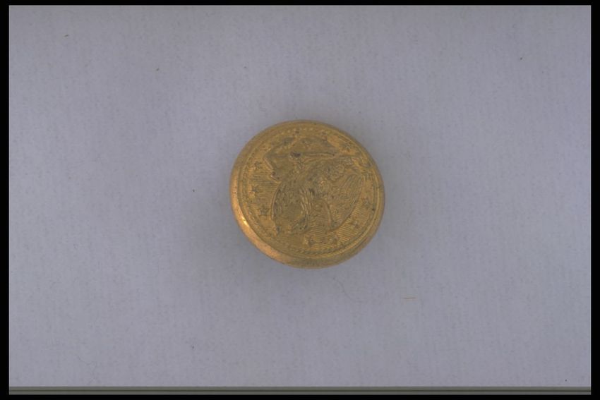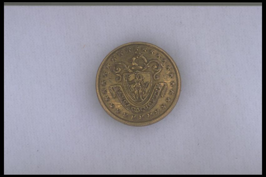 Round clothing button depicting part of the seal of the Commonwealth of Massachusetts. Gold-painted wood forms the main part, mounted on a metal back. The front depicts a Native American holding an arrow in his left hand and a bow in his right hand, with a star in the upper left, all inside a shiel...