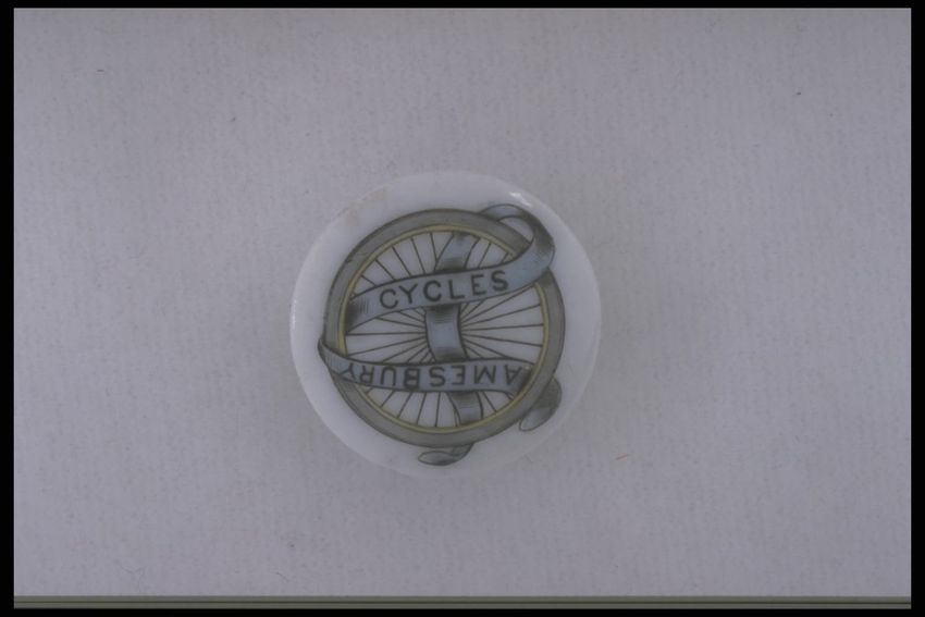 Round porcelain button with a white ground printed with promotional design of a spoked bicycle wheel in shades of grey and black with an interlaced yellow ribbon inscribed in block font, "AMESBURY CYCLES".