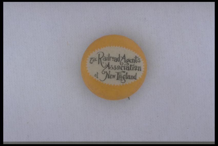 Round yellow button with inscription printed in black on an oval white ground, center front: "The Railroad Agent's Association of New England." Closure with a metal pin and hook on back. Maker's label on back [See inscriptions].