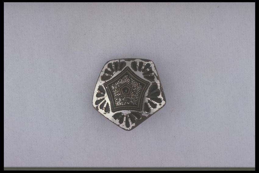 Pentagon shaped silver plated buckle with incised foliate decoration around edges and 2 graduated pentagons inside larger pentagon shape. There is a bar with "C" curve in center of buckle.