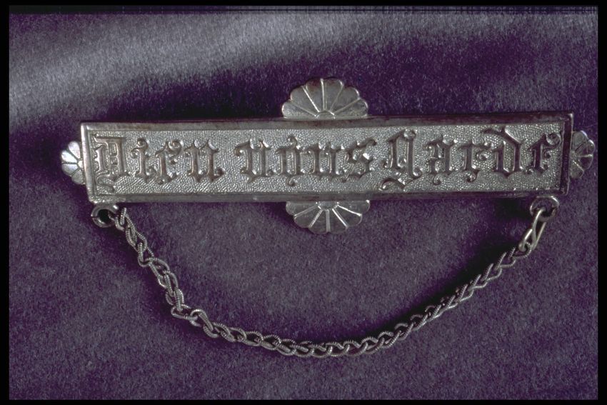 Metal brooch with dependent textured curb chain and paired fans centered at top and bottom of long brooch sides. Embossed inscription "Dieu vous garde" meaning "God Bless You" or "God Keep You".