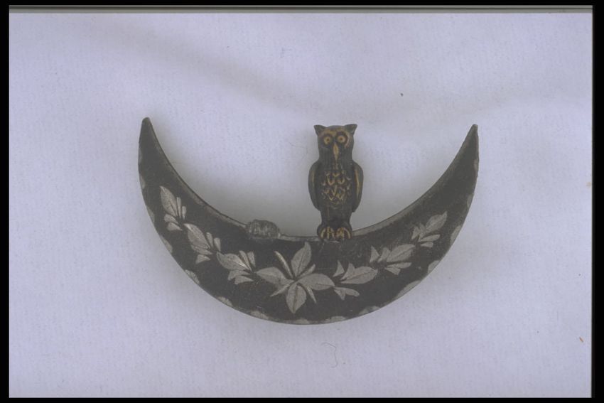Brooch representing a crescent moon with etched foliate trail and bronzed owl sitting on top of moon; pin on back (broken clasp). There appears to be a second set of set of owl feet on moon (possibly the second owl has broken off).