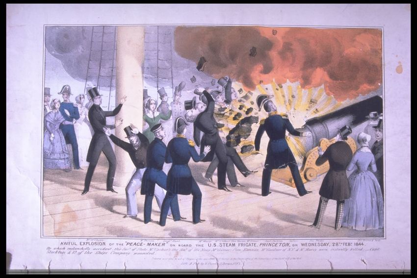 Wood and paper folding fan composed of 30 black painted slats held w/ brass/copper pin and loop to hold tassel. Outside slats w/ gold pine leaves. Fan of gold painted paper w/ black edges and white, blue, red, green flowers, leaves and insects. Reverse blue background w/ painted black landscape and ...