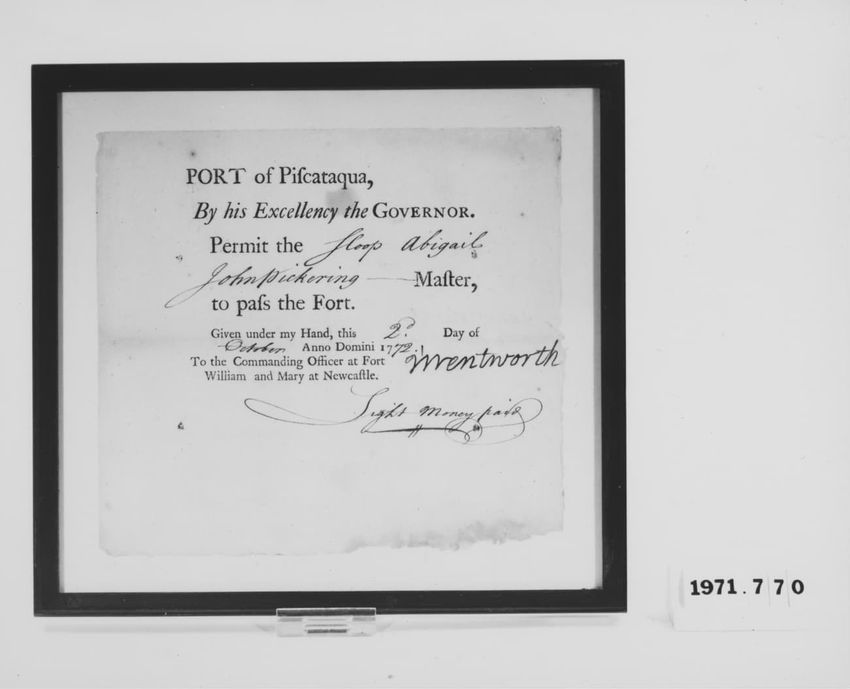 Permit for Nathan Lord, Commander of the Brig. "Hitty" to carry his shipment of "Lumber, Beef, and Corn" to Tobago; written in four languages (French, Spanish, English and Dutch); signed and sealed by President John Adams (US seal) and countersigned by Secretary of State Timothy Pickering; under gla...
