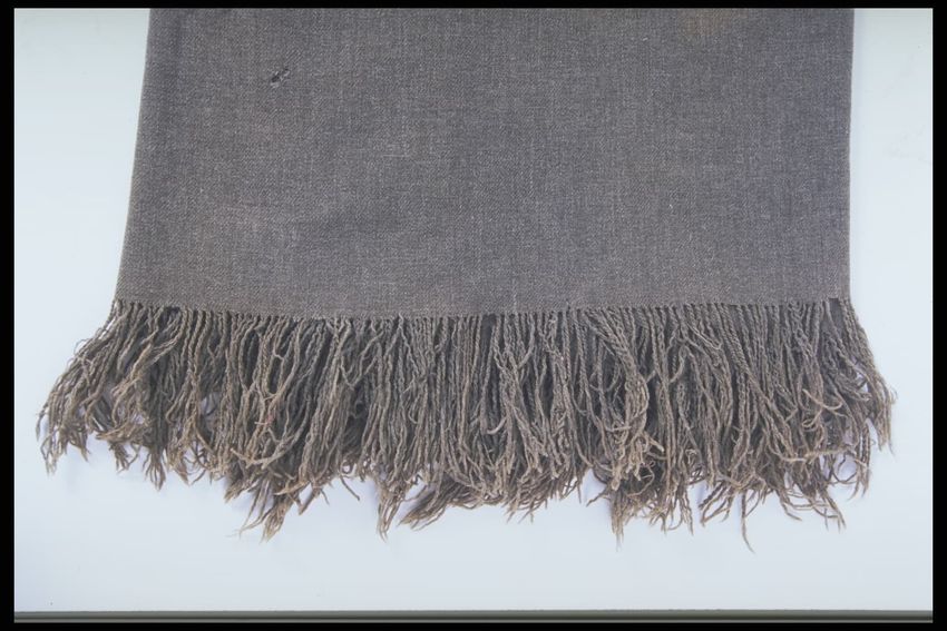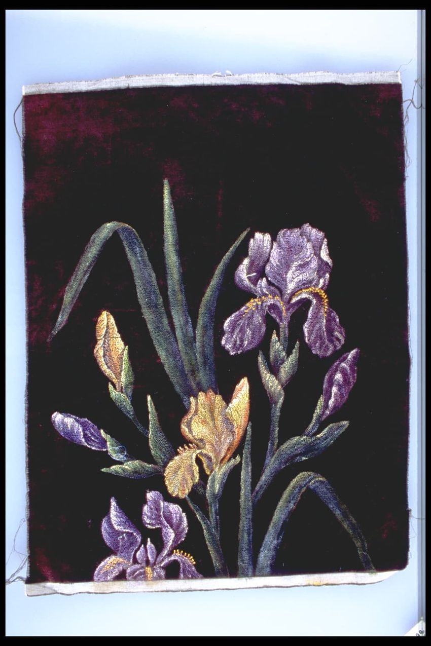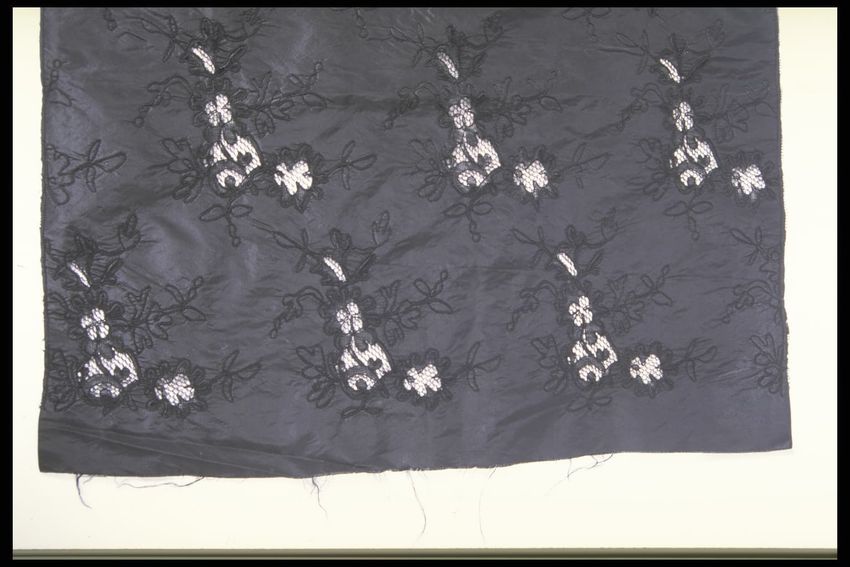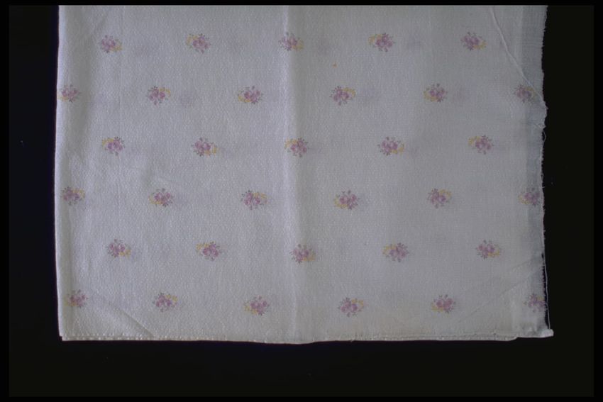 Half oval pouch, white linen w/ blue cotton trim and embroidered figures of two dancing girls at center. Girls are embroidered in black and have colored pink arms, yellow clogs, and blue legs and hat ribbons. Dresses and hats not colored. White buttons sewn and painted for faces. Expandable sides an...