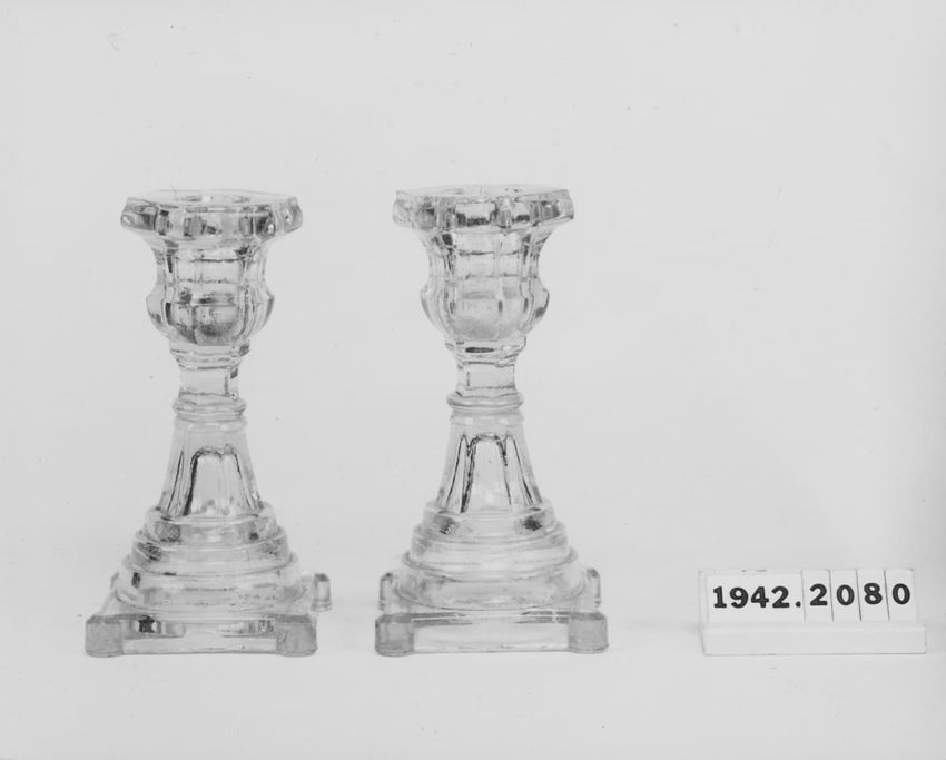 Clear, colorlss; round base, short stem, round body with swags & ovals