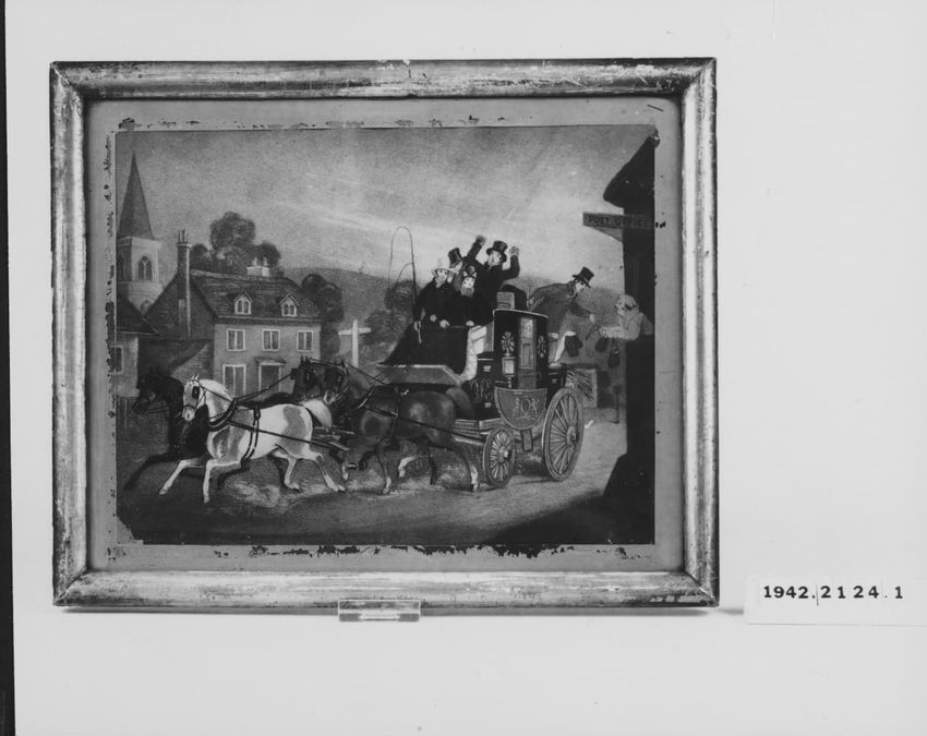 Urban; 5 people travel by stagecoach; stopped to pick up mail.
