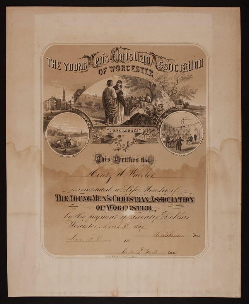 Map of Brookline, from the Charles River to Roxbury and Newton. Also drawings of notable buildings of the town: the Town House, the Congregational Church, the Harvard Church, and the Baptist Church.