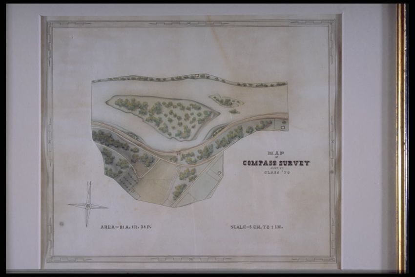 Framed compass survey map by RHT Jr. (III); overhead drawing and watercolor of area w/ trees, water, roads, and sectioned off land; lower left corner w/ 4 pointed compass symbol and inscription "AREA-91 A. 1R. 34P." In right lower corner, "SCALE--5CH. TO 1 IN." Mounted in 1 1/2" wood and gilt frame.