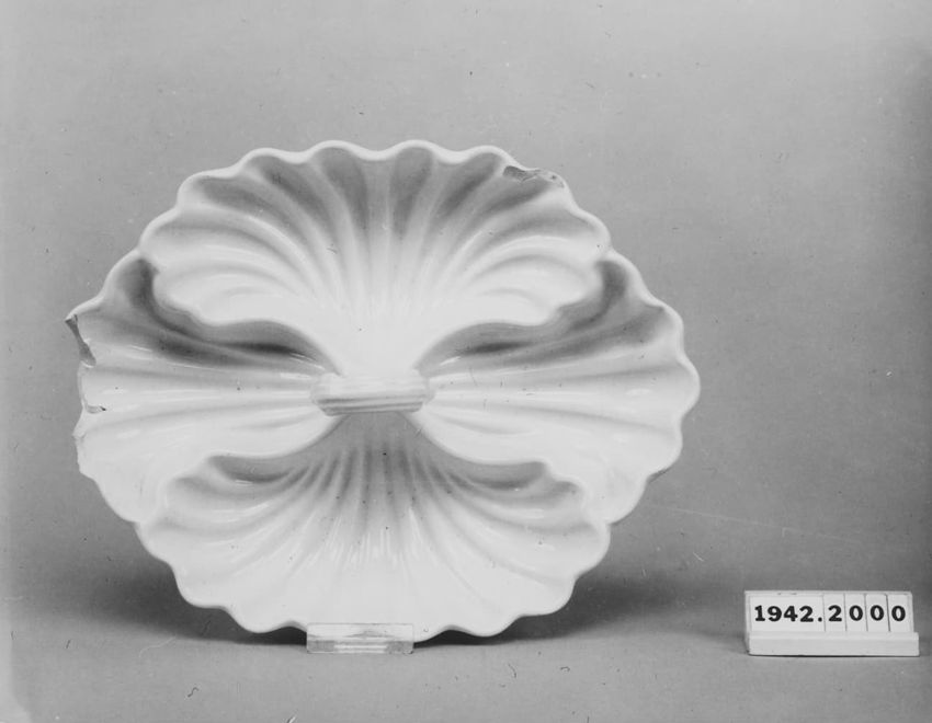 Cream, bl, green; oval, openwork basket, pinched middle; appld. flowr