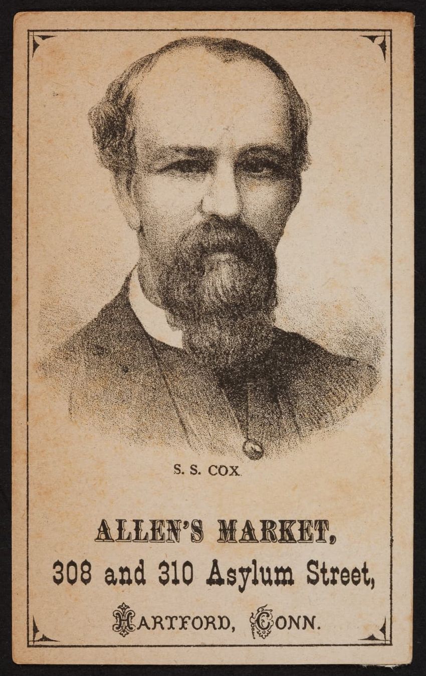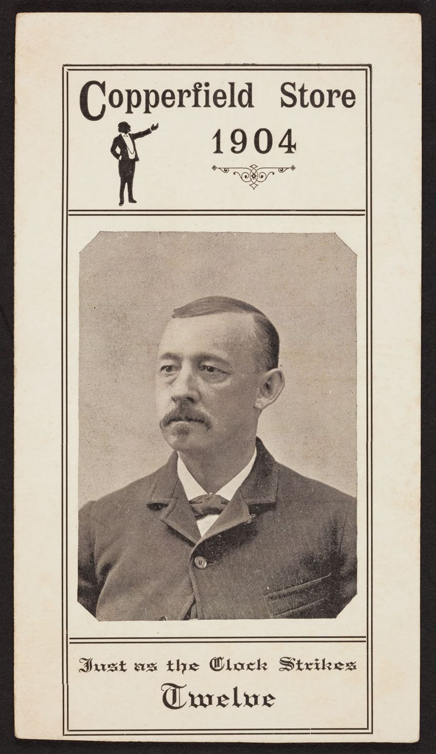 The image portrait is Fred W. Farnham, proprietor of the Copperfield Store. The Store carries men, women and children's clothing, carpets, small wares and groceries. The brochure is a New Year's greeting.