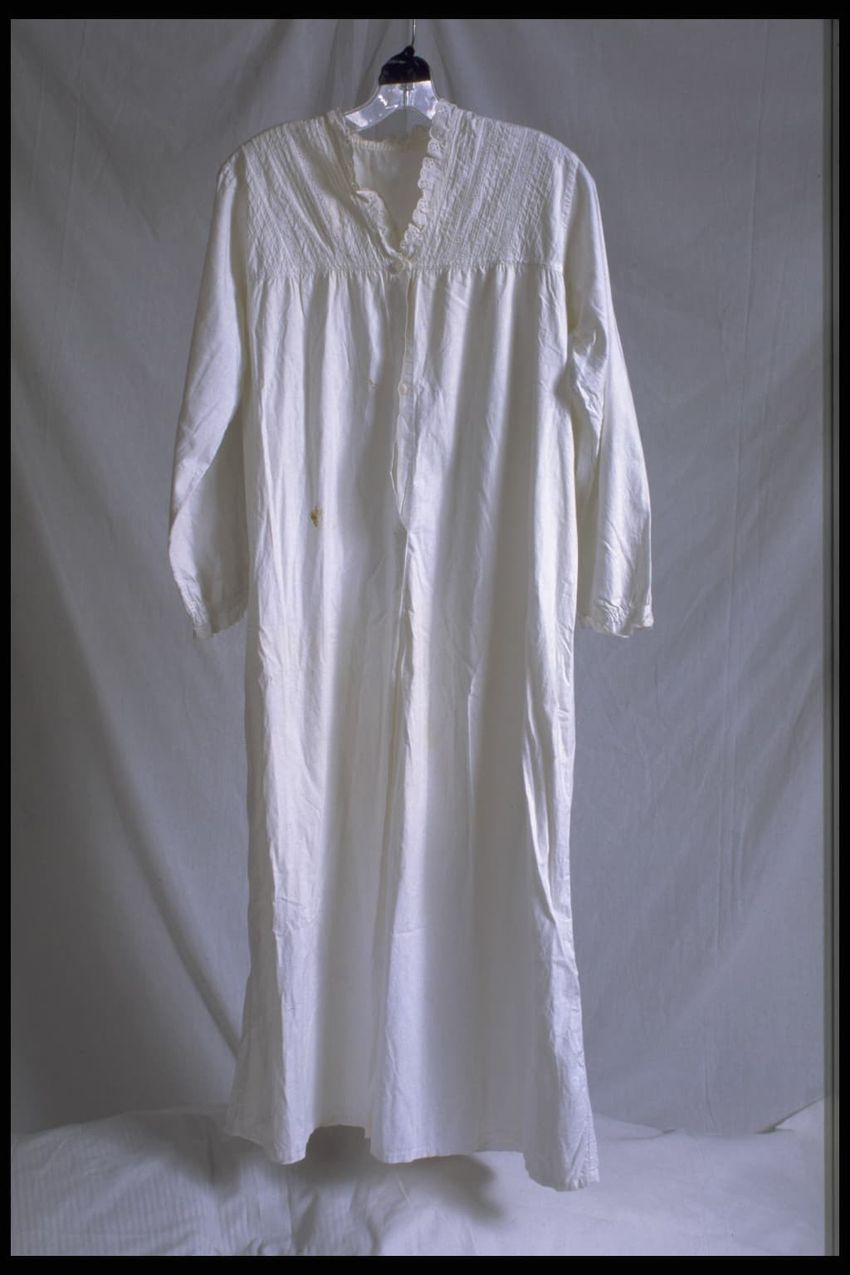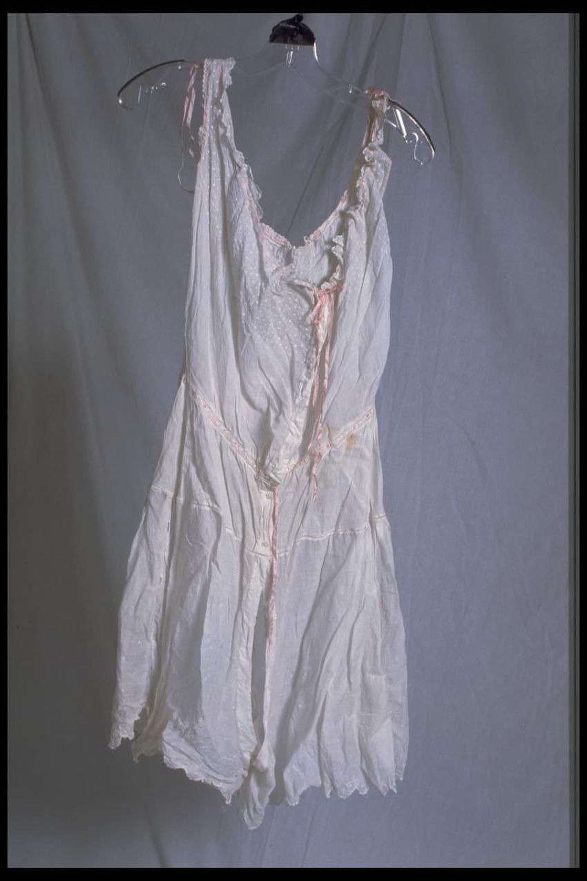 Cotton slip decorated w/ pink ribbon around neck and shoulder straps and around waist. Scalloped embroidery at bottom of legs and polka dots on front, chest. 6 buttons for front closure, eyelet trim. Open crotch. Tucks on back.