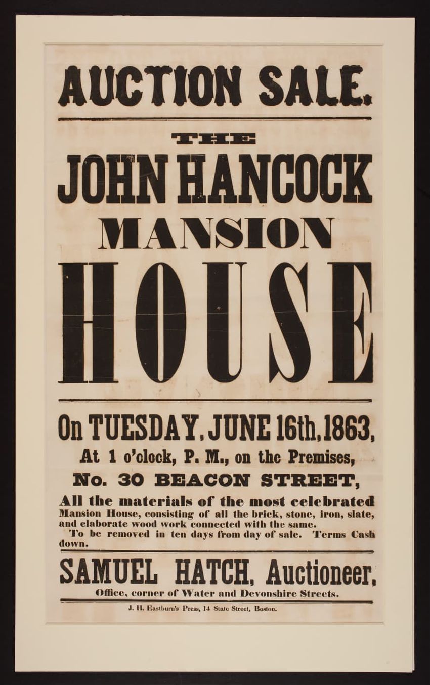 Auction for the John Hancock House, "All the materials of the most celebrated Mansion House, consisting of all the brick, stone, iron, slate, and elaborate wood work connected with the same." Auctioned on June 16, 1863 by Samuel Hatch, auctioneer.