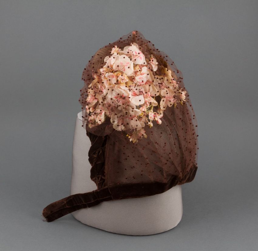 Light blue corded uncut silk velvet; trimmed with self rosette on top with white lace; neck ruffle edged with white lace and tulle; face of brim trimmed withs tulle, white lace, large pink artificial flowers, buds, berries and leaves; lined with canvas, wool batting and cream silk; wire frame; wide ...