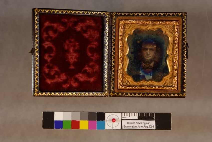 Young man with dark hair and a beard, wearing a striped tie, white shirt, and dark coat. The daguerreotype is housed in an elaborate wrought iron rose and shell scroll frame.