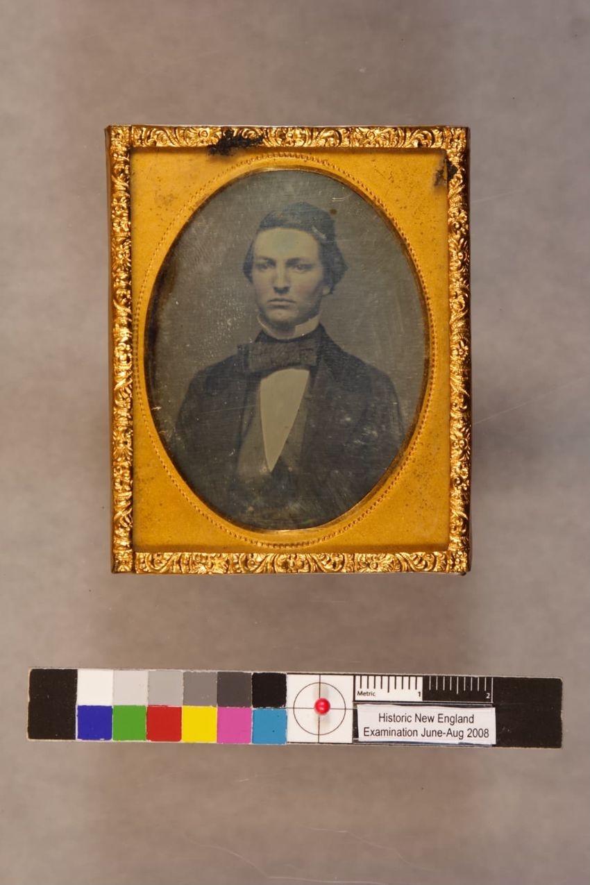 young man [possibly member of Codman/Bradlee family] with long sideburns and moustache with dark tie, white shirt and dark jacket