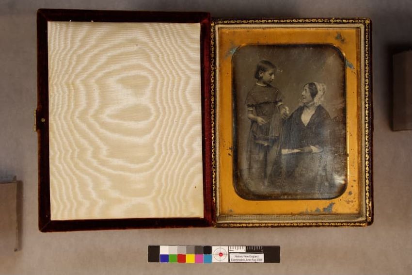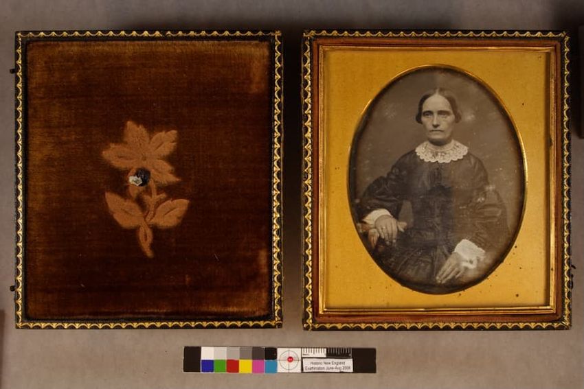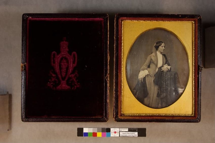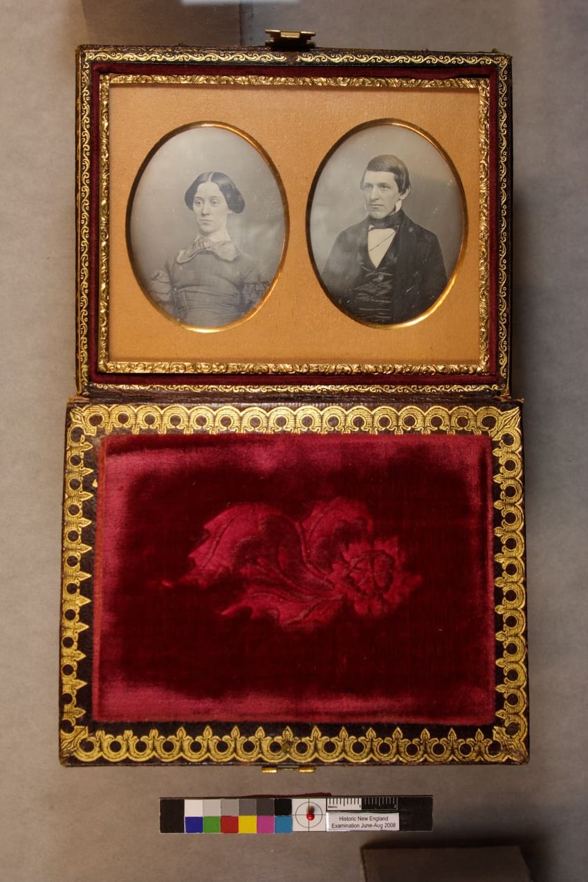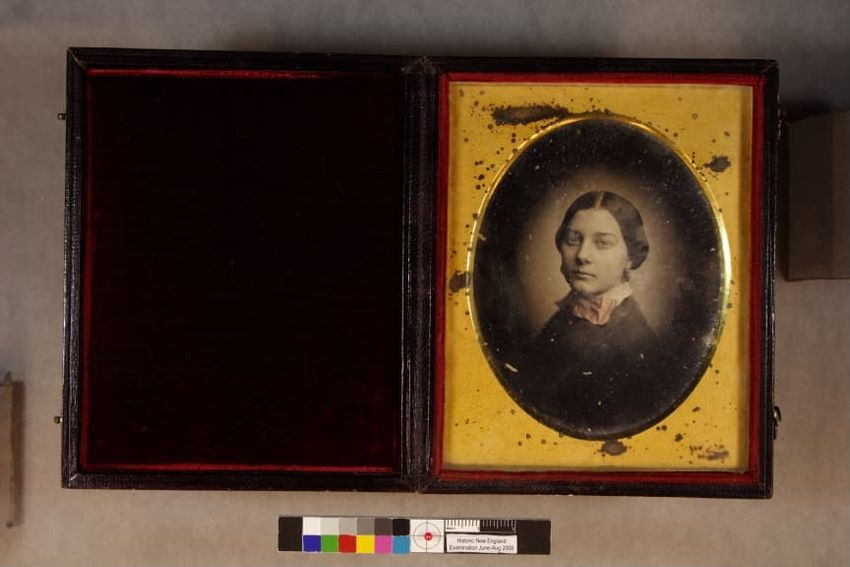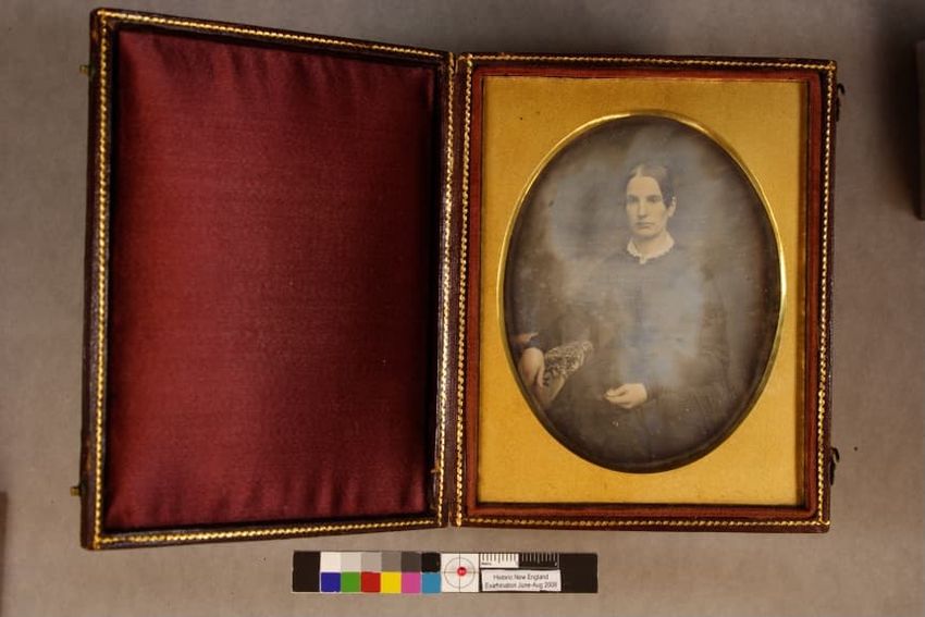 very elaborate image depicting Hattie B., a beautiful, fashionable young woman, embellished by gold-tinted jewelry and tinted accessories; the case includes a lock of hair and a poem