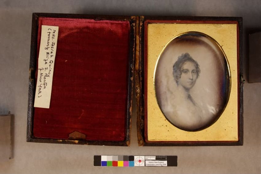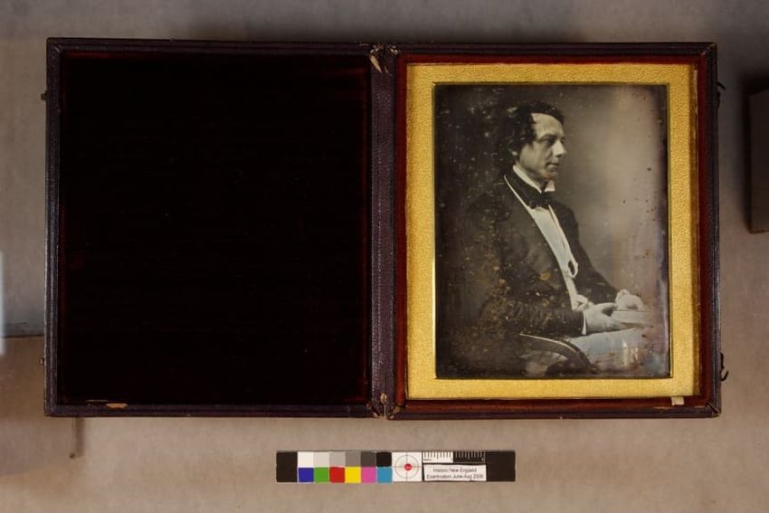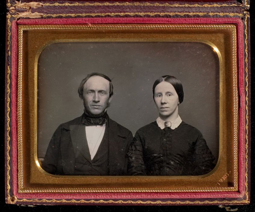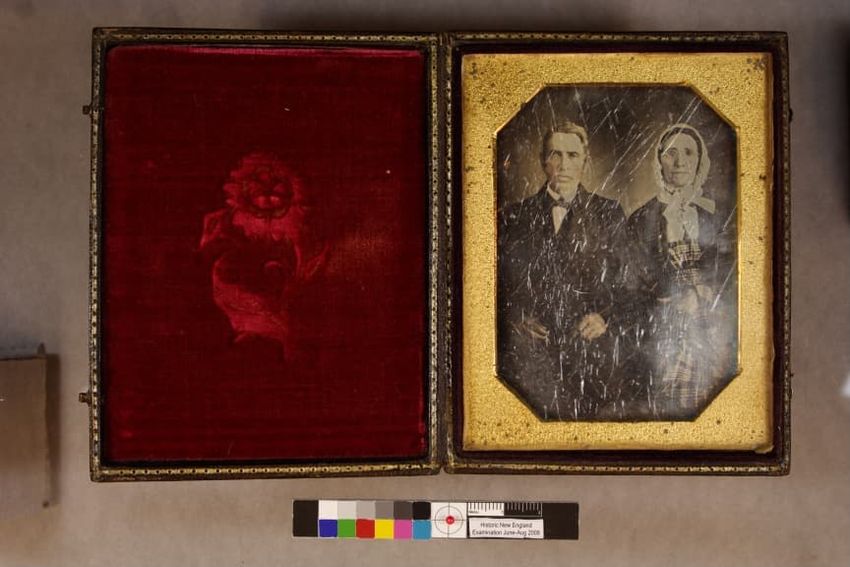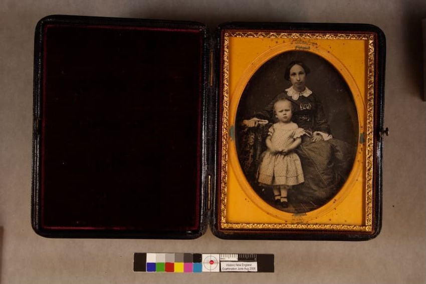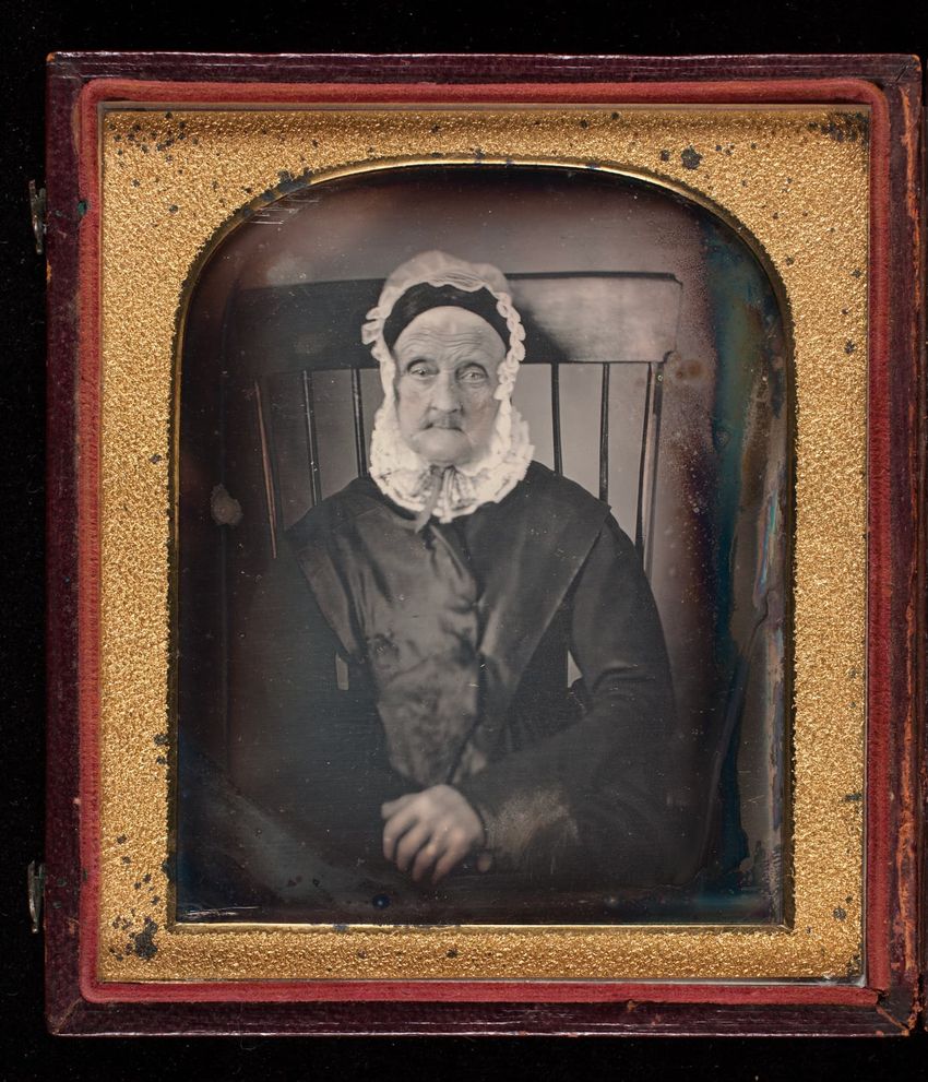 very elaborate image depicting Hattie B., a beautiful, fashionable young woman, embellished by gold-tinted jewelry and tinted accessories; the case includes a lock of hair and a poem