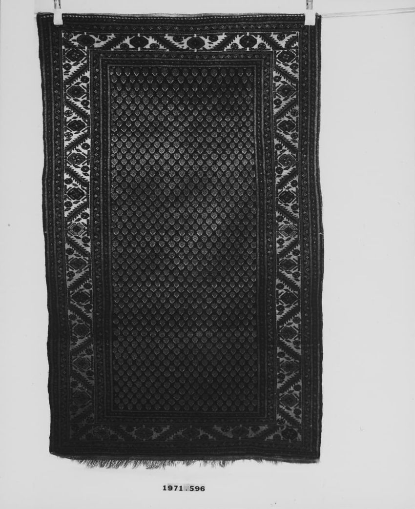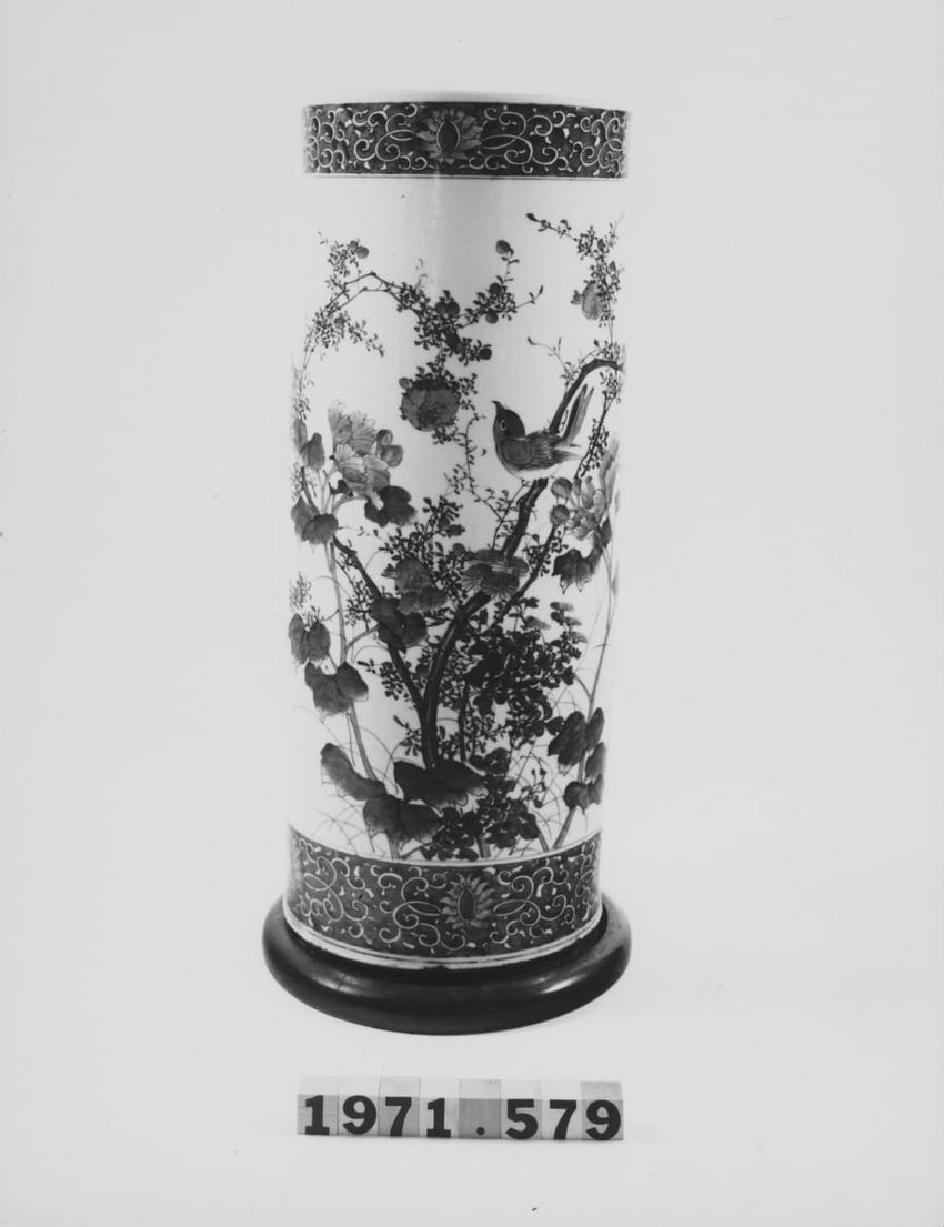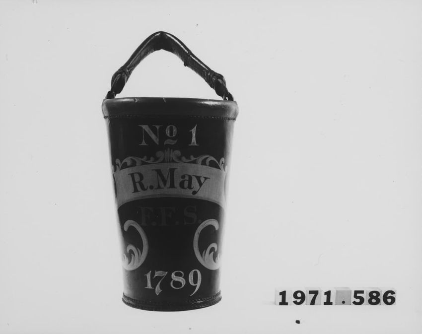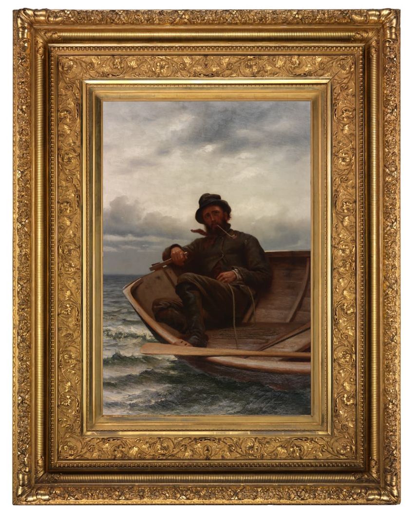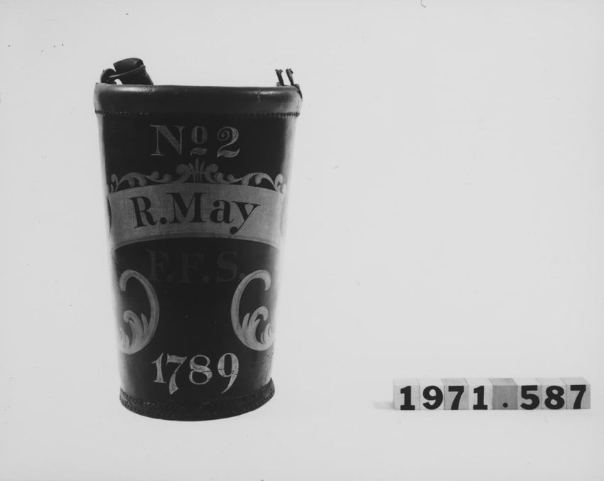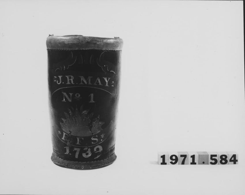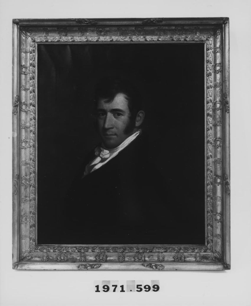Sitter seen from waist up, three-quarter facial view, wearing dark coat, striped short tie, white shirt, striped vest; plain background. Enclosed in black leather case with tooled quatrefoil motif on front and back cover; inside, right side encloses ambrotype mounted under glass with oval gold metal...