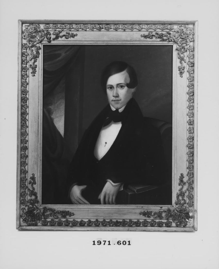 Black and white engraving of a scene from Shakespeare's King Henry the Fourth set in Boar's Head Tavern; Henry, standing to the left, is addressing Falstaff, sitting to the right; four other figures in background; molded pine frame with gilt and gesso on front.
