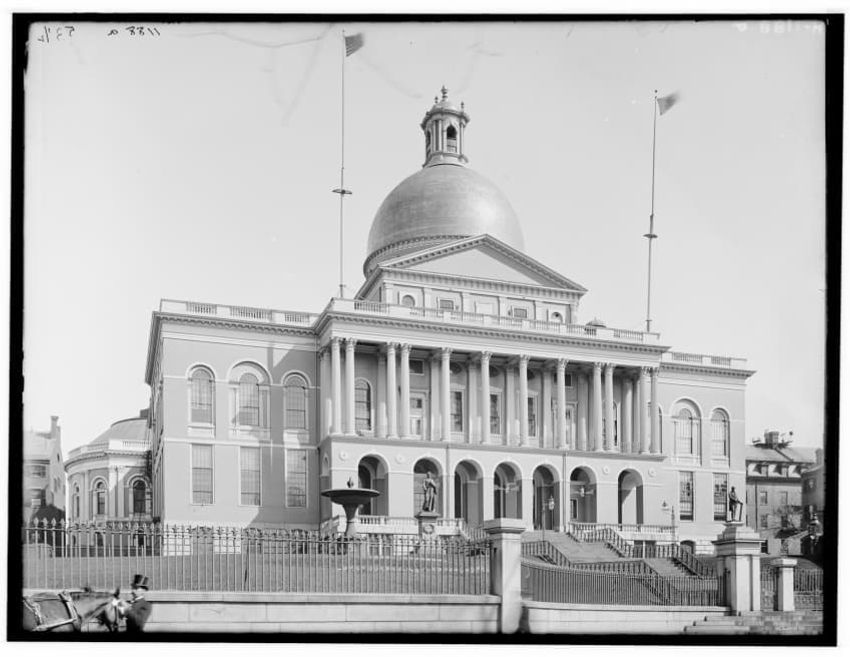 The image depicts a section of the Boston Public Library in Copley Square, Boston, Massachusetts. In the foreground, there is a statue of a seated figure in a draped garment on a stone pedestal, which is inscribed with the names "Newton," "Darwin," "Franklin," and "Morse." Another nearby pedestal on...