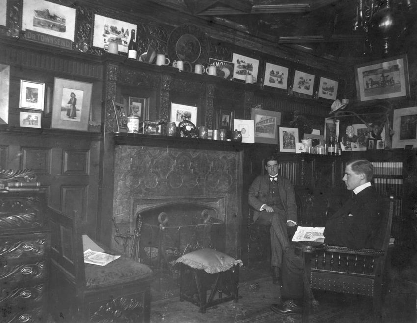 Interior photograph of the dormitory sitting room of Alfred Gwynne Vanderbilt and William Fitz Hugh Whitehouse, Jr. at Yale University in New Haven, Connecticut. They graduated in 1899. Vanderbilt died when a German U-boat sank the ocean liner RMS Lusitania on May 7, 1914.