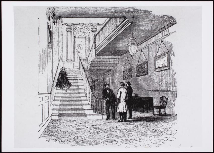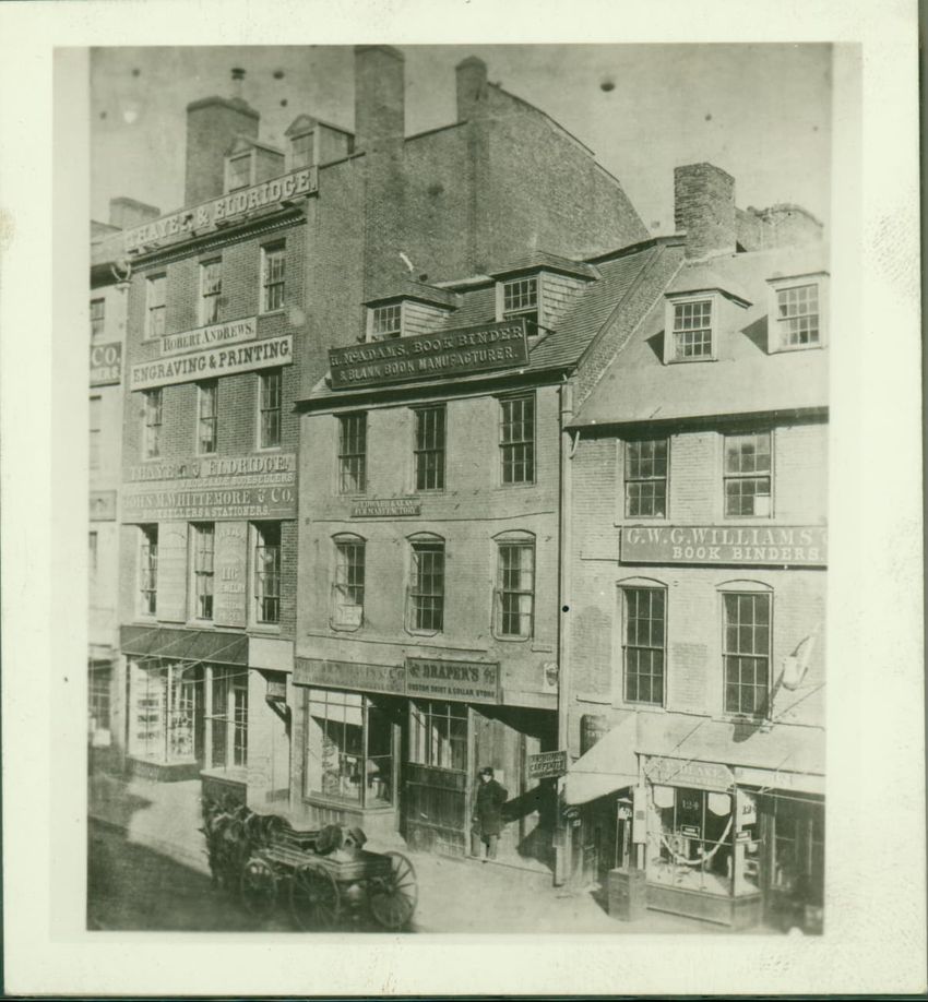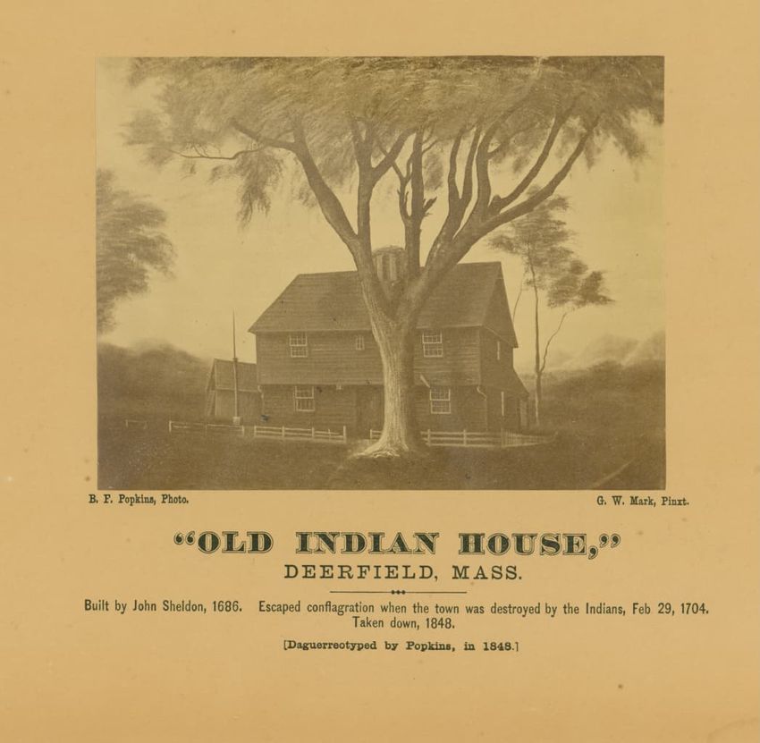 The caption reads "Built by John Sheldon, 1686. Escaped conflagration when the town was destroyed by the Indians, Feb. 29, 1704. Taken down, 1848. Daguerreotyped by Popkins, in 1848." Below the image it reads "B.F. Popkins, Photo., G.W. Mark, Pinxt."