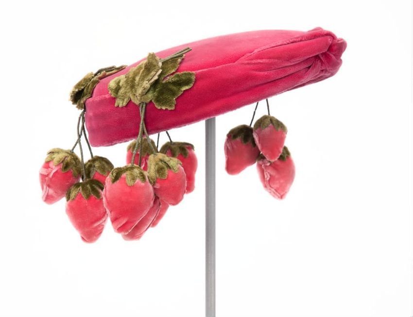 Straw, braided; wide brim curves around face, and neck; rounded edges with wire support; brim is approx. 7" wide; crown is round and lined with brown paper, and is approx. 4 1/4" deep; neck ruffle, rosettes at sides, and ribbon ties of same piece of brown, coral, green and cream plaid silk ribbon; r...