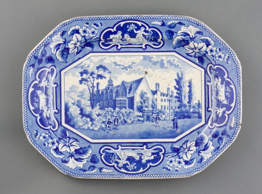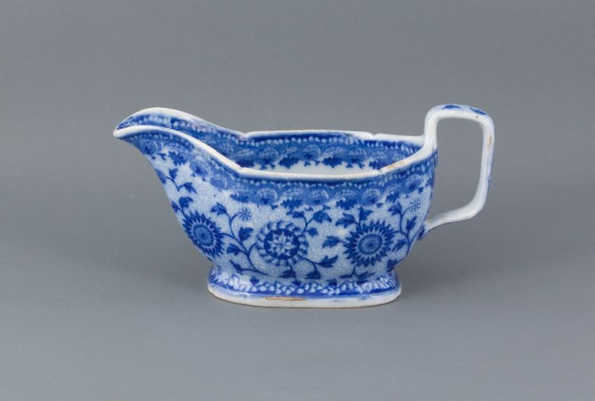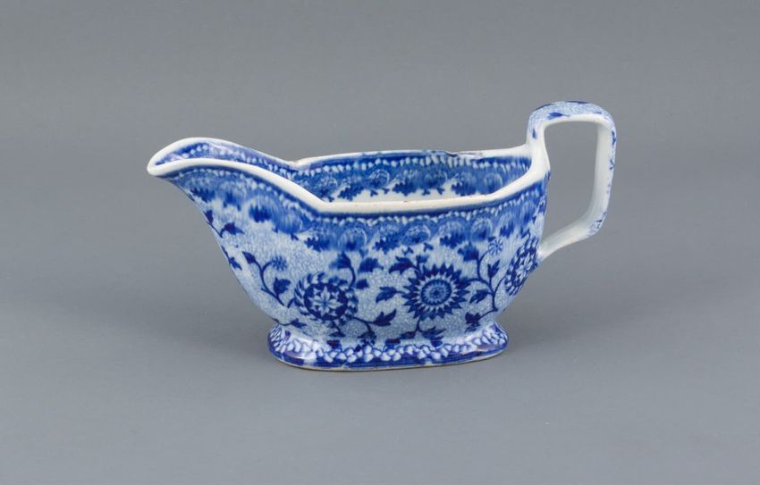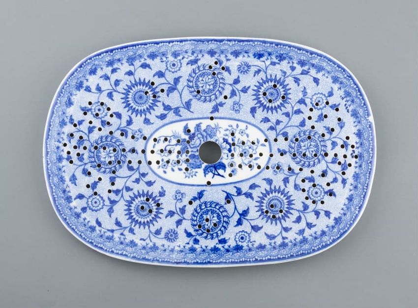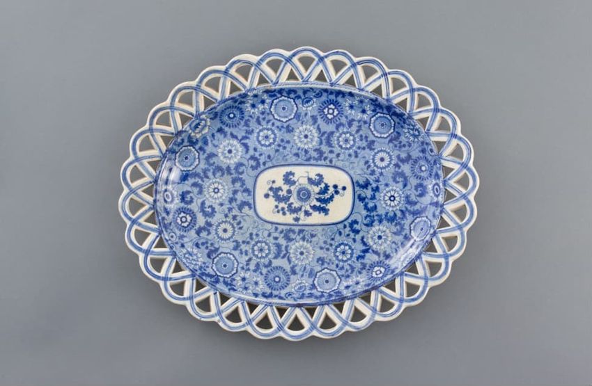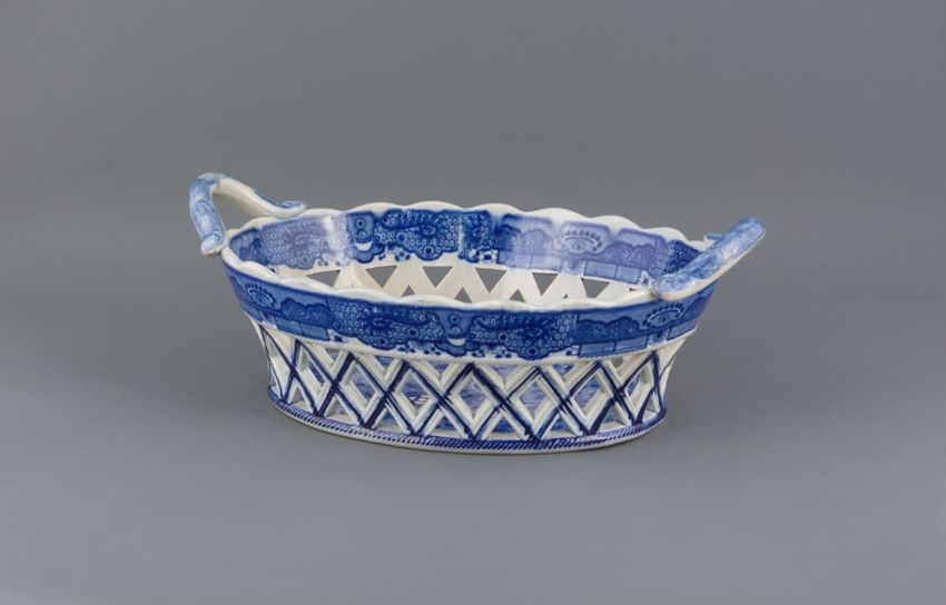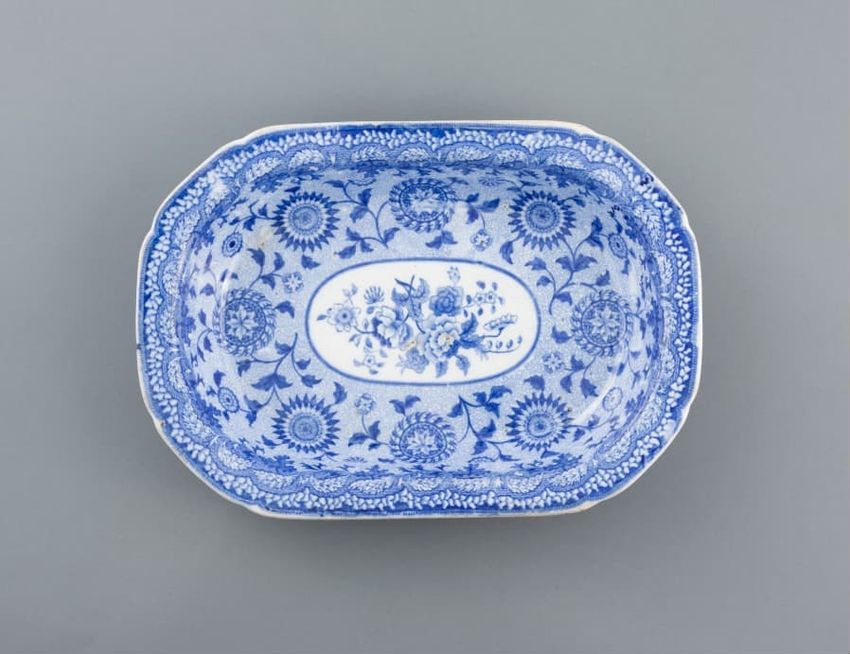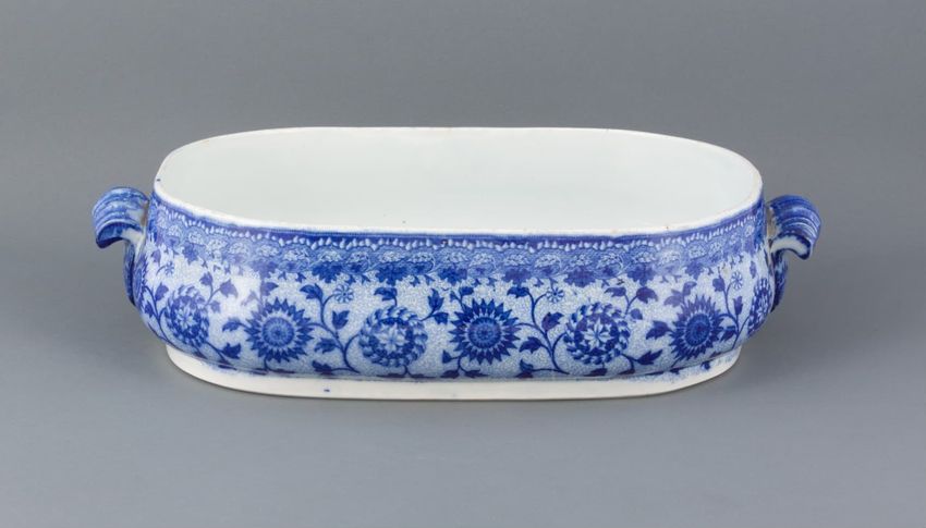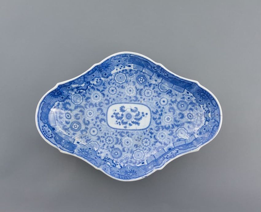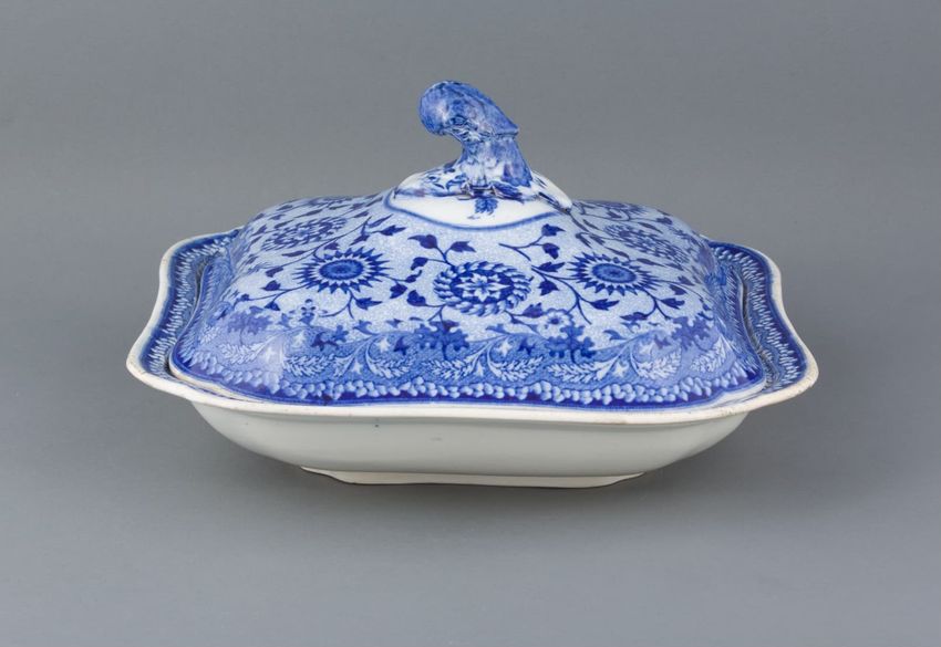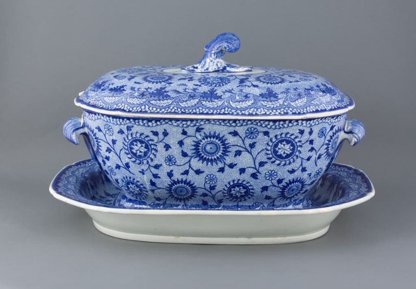 A blue transfer printed three piece tureen set which consists of a stand, tureen, and cover. Both the stand and the tureen have a central floral medallion surrounded by an inner floral border superimposed on a rounded diaper pattern and an outer foliate border. The outside of the tureen also has the...