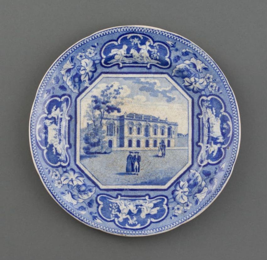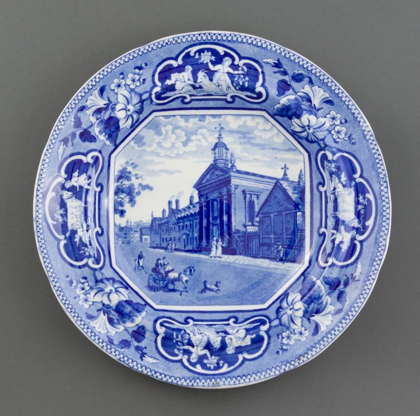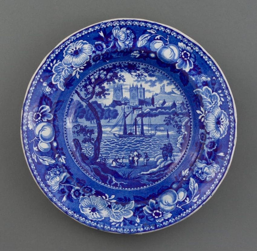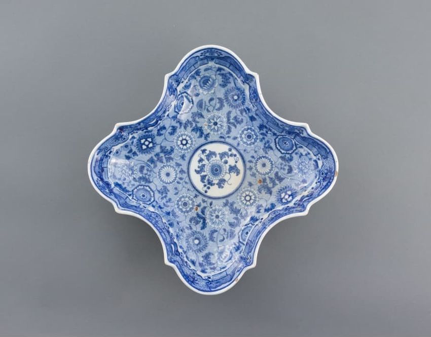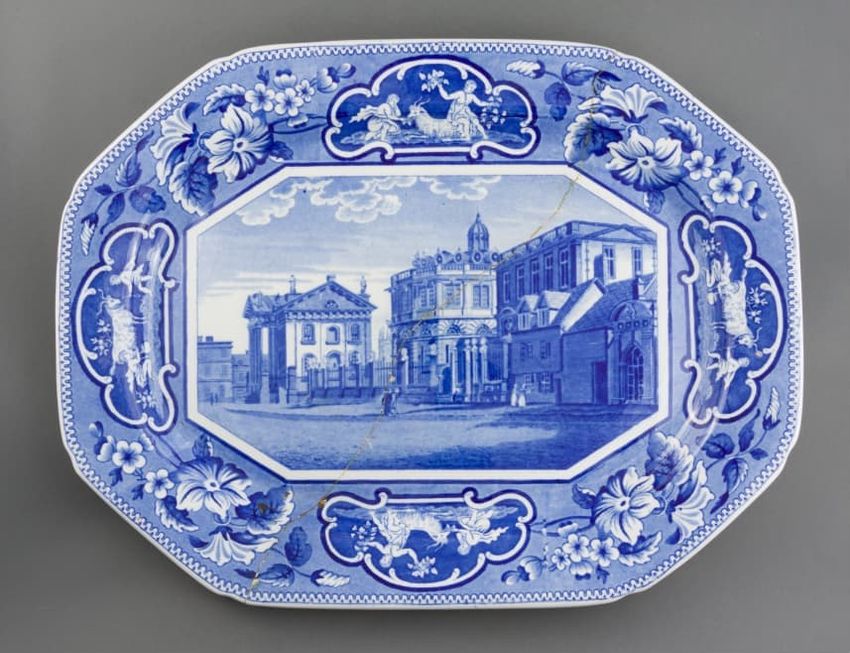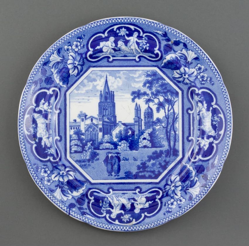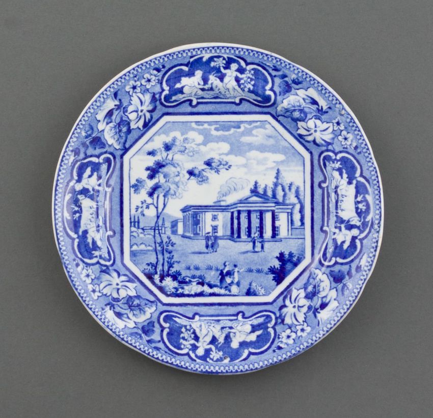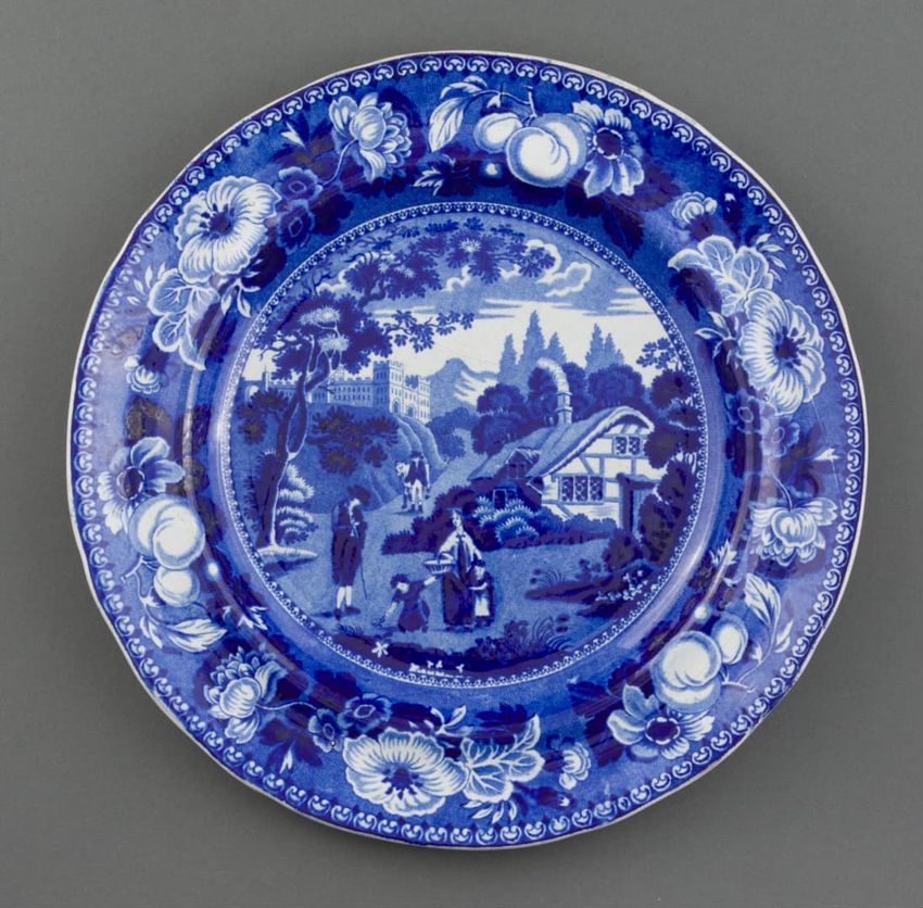 A blue transfer printed three piece tureen set which consists of a stand, tureen, and cover. Both the stand and the tureen have a central floral medallion surrounded by an inner floral border superimposed on a rounded diaper pattern and an outer foliate border. The outside of the tureen also has the...