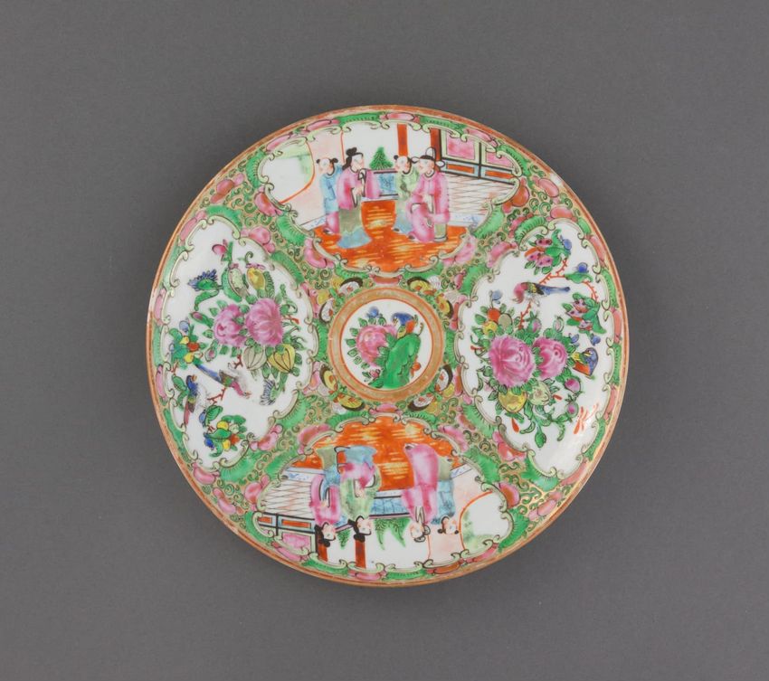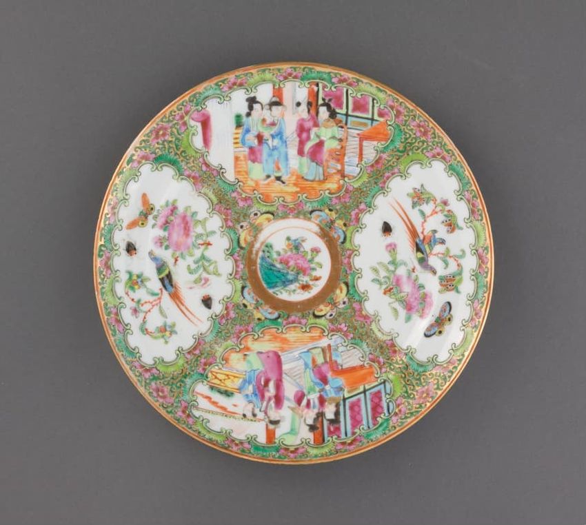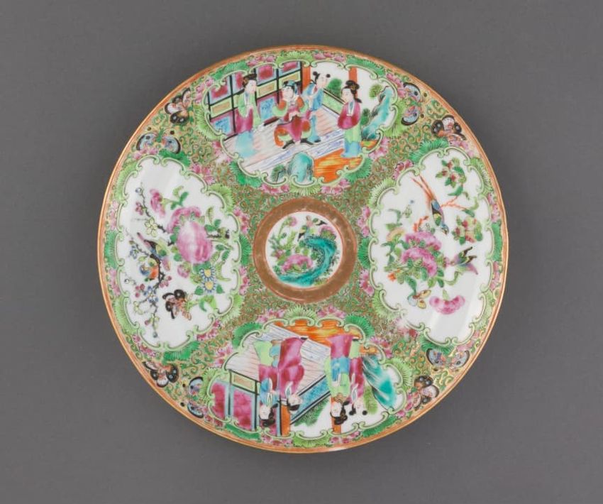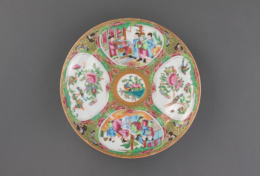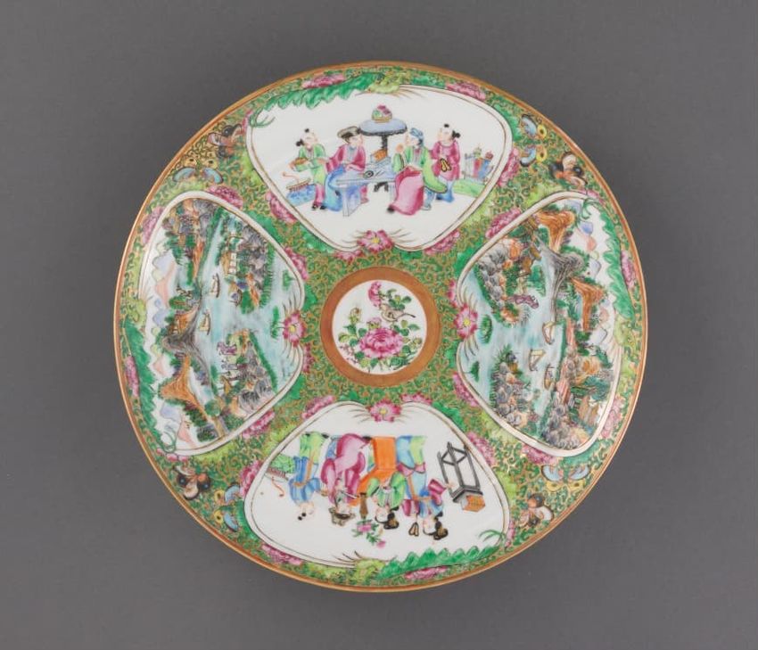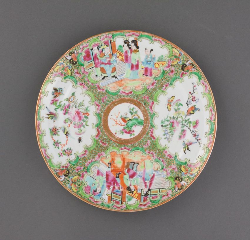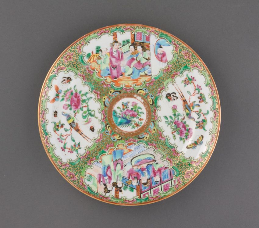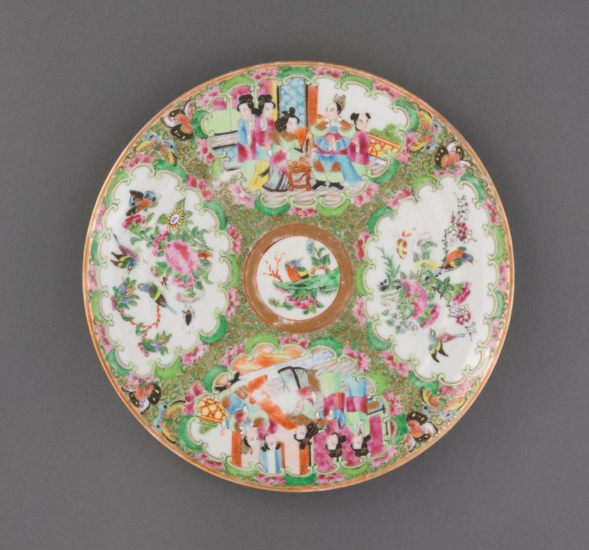 Porcelain enameled soup plate. On gold ground, green tendrils and pink tree peonies; central medallion, bordered in gold, depicts a bird and pink peonies; four scrolled medallions with butterflies around them depict 1) four figures seated and standing around table and 2) scenic view of river, boats,...