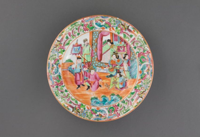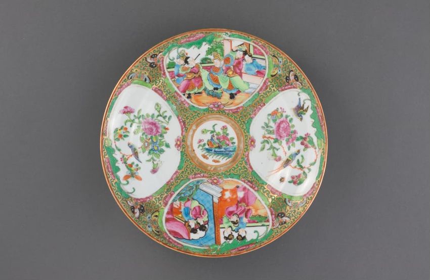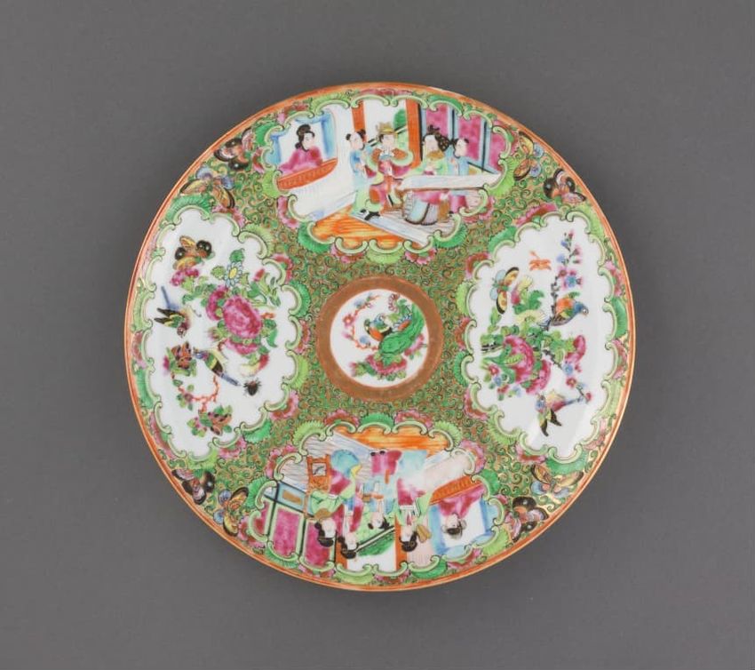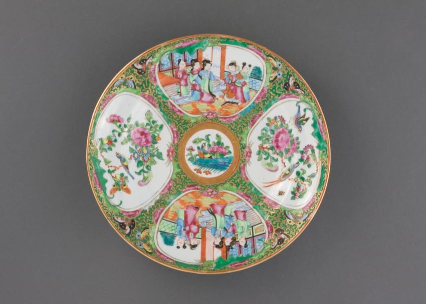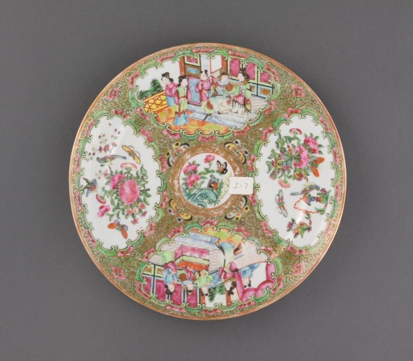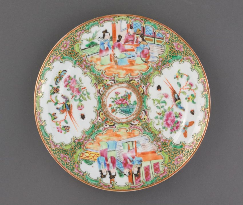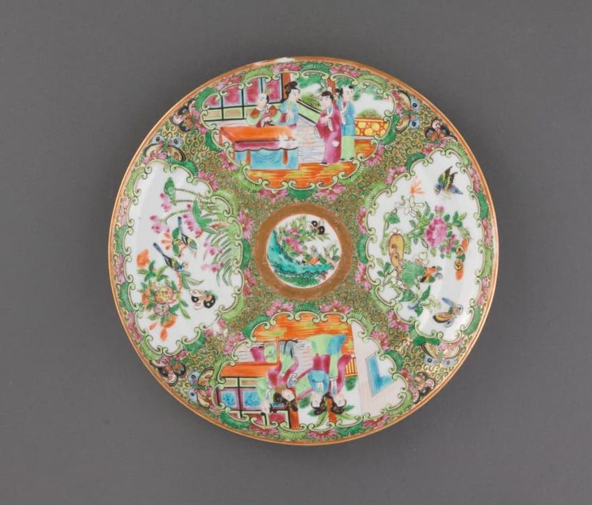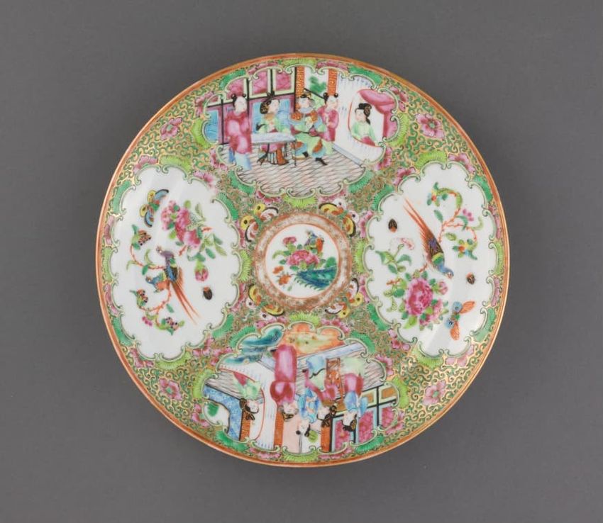 Porcelain enameled soup plate. On gold ground, green tendrils and pink tree peonies; central medallion, bordered in gold, depicts a bird and pink peonies; four scrolled medallions with butterflies around them depict 1) four figures seated and standing around table and 2) scenic view of river, boats,...