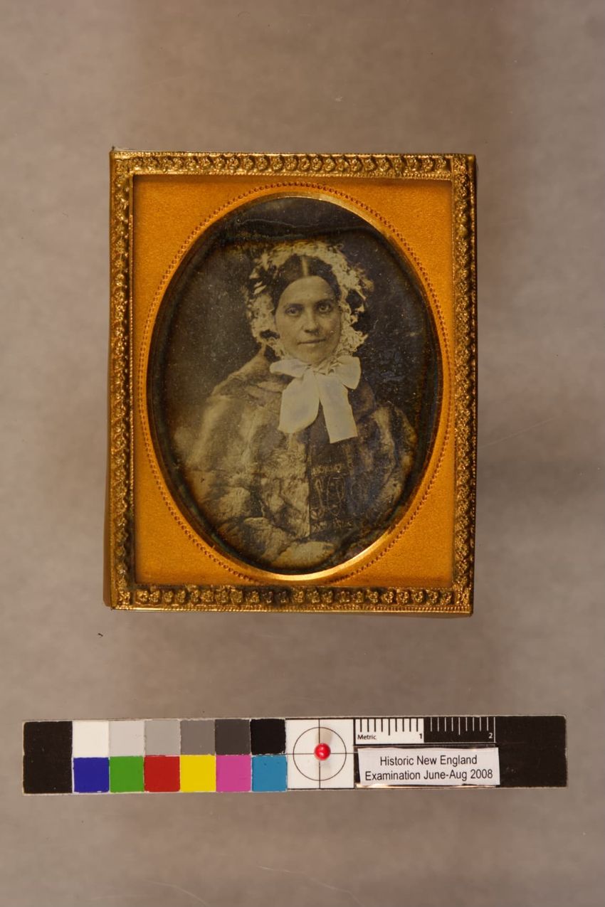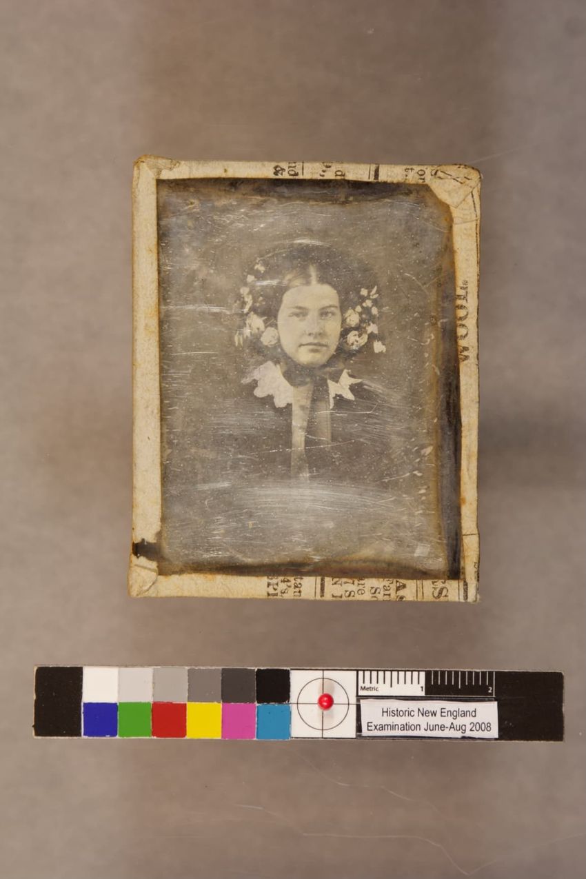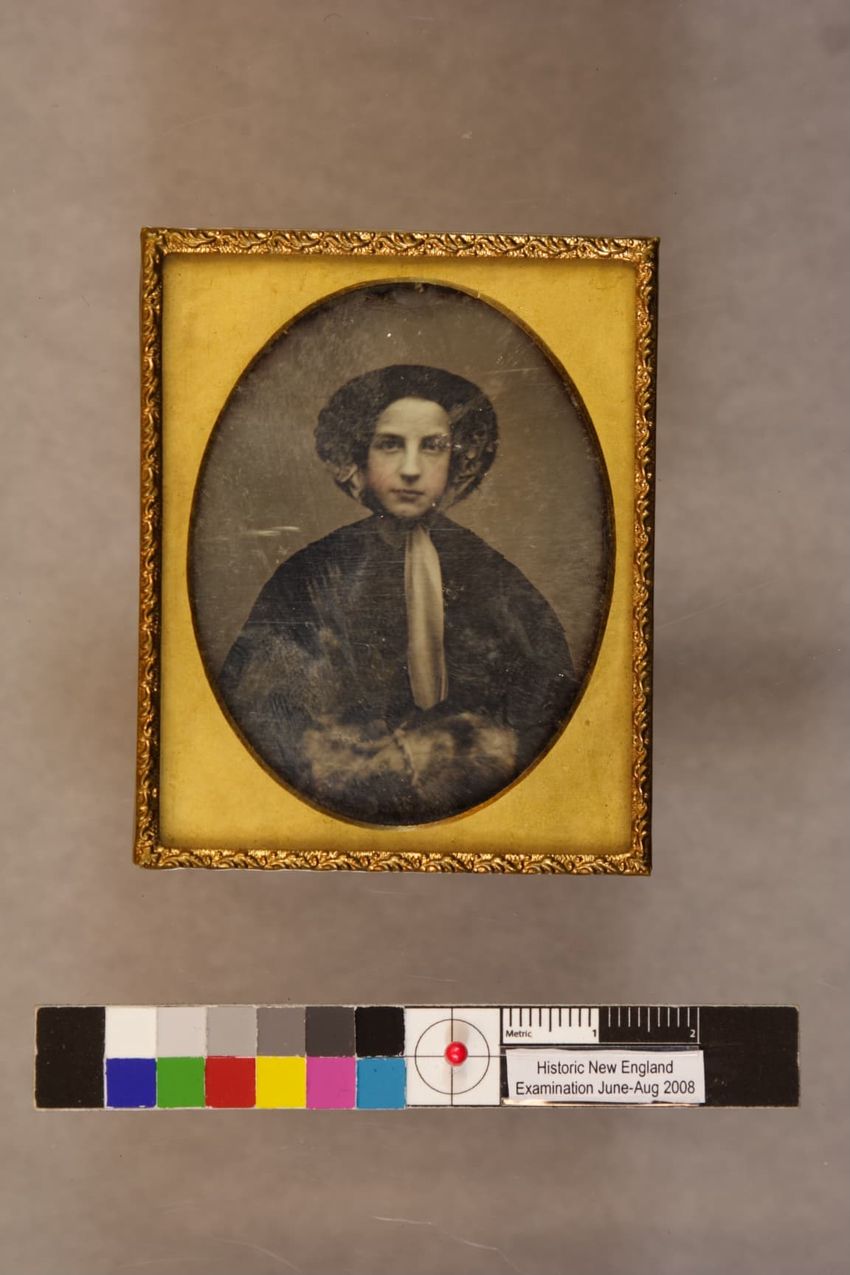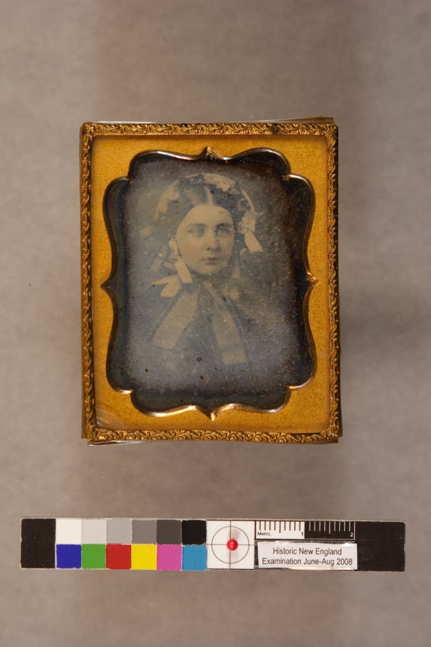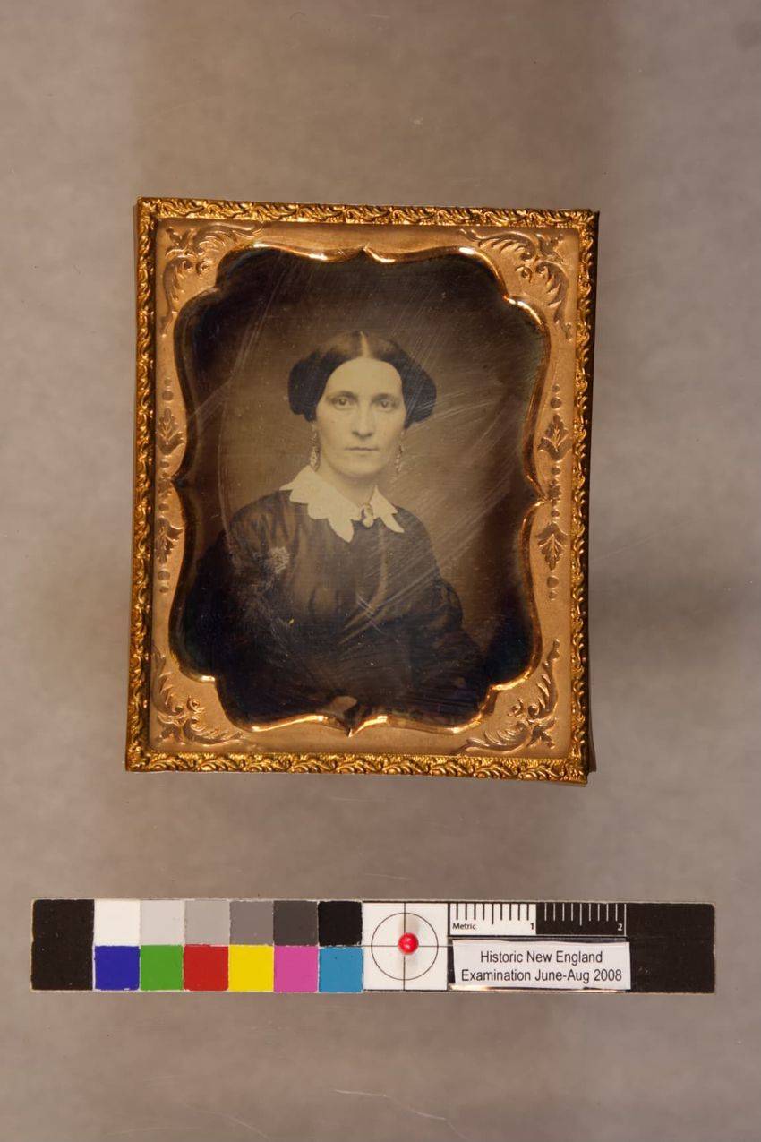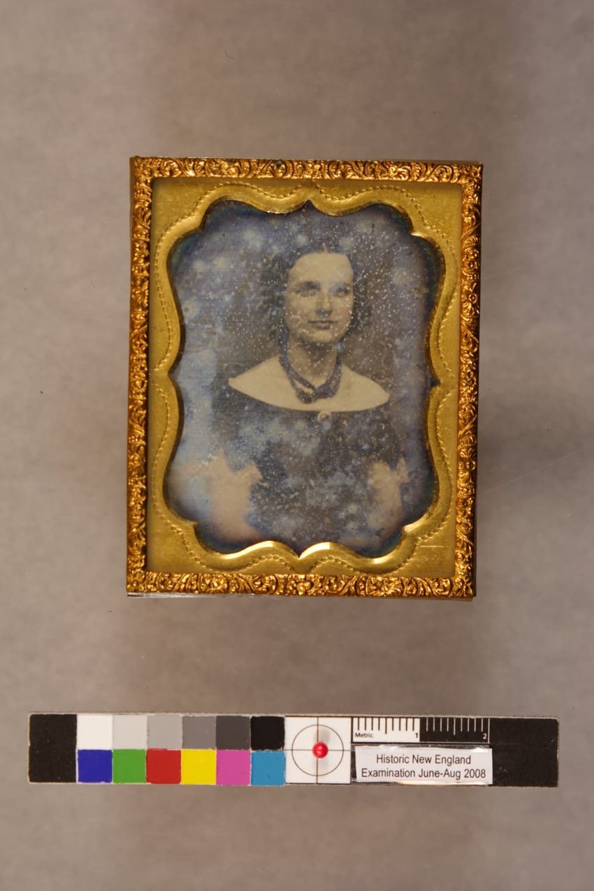 Young woman wearing a décolleté dress and necklace. Walter B. Eastman, proprietor of John Plumbe's Boston franchise, took over the studio soon after this image was taken.