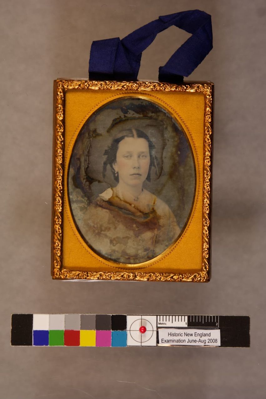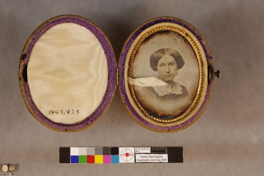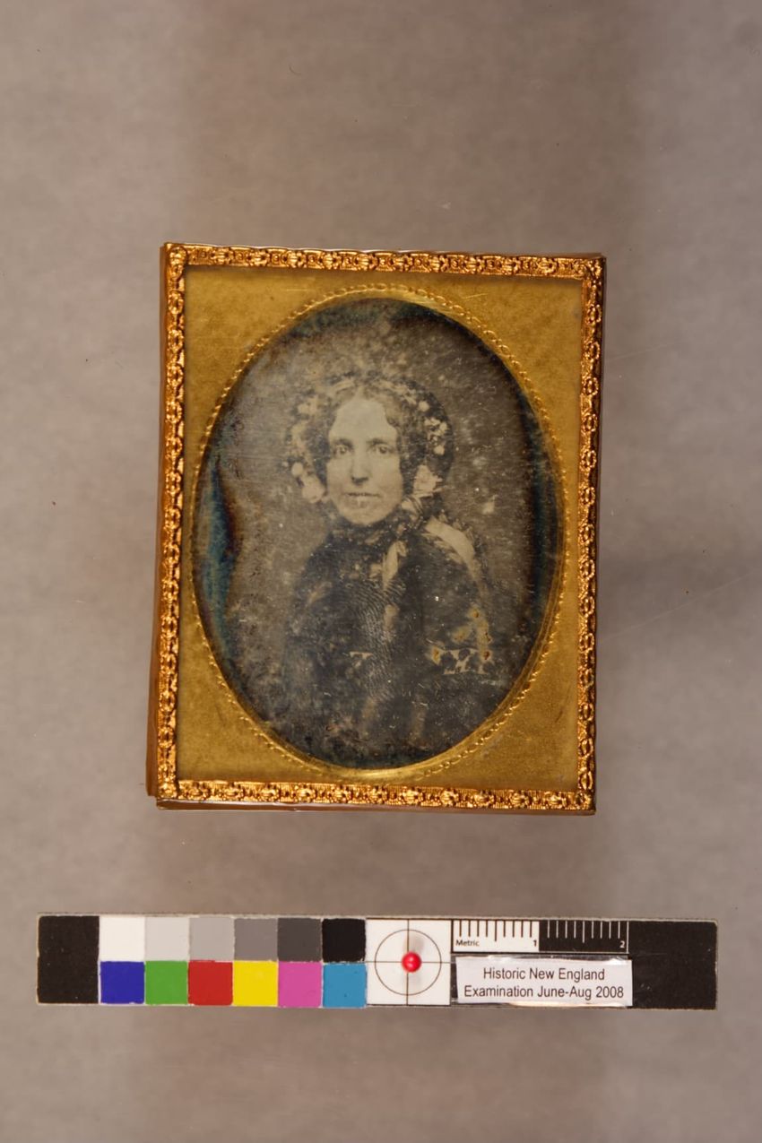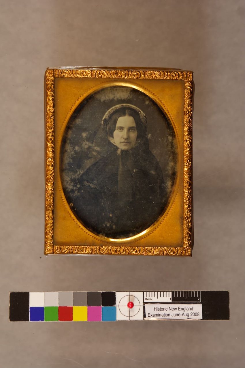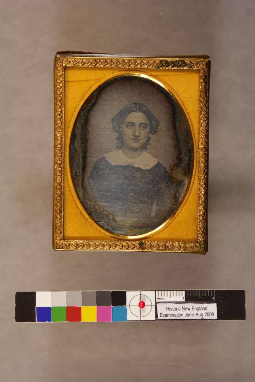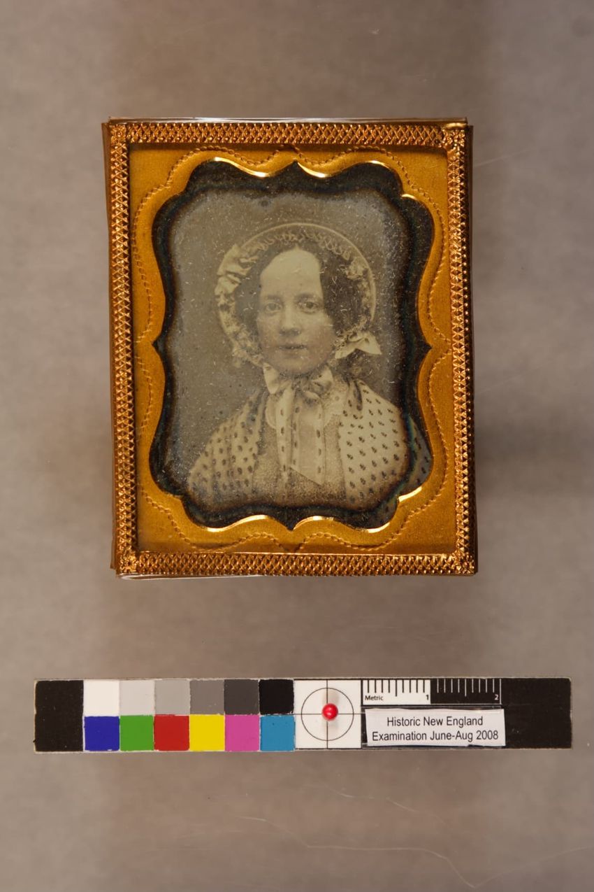 Young woman wearing a décolleté dress and necklace. Walter B. Eastman, proprietor of John Plumbe's Boston franchise, took over the studio soon after this image was taken.
