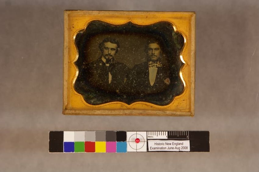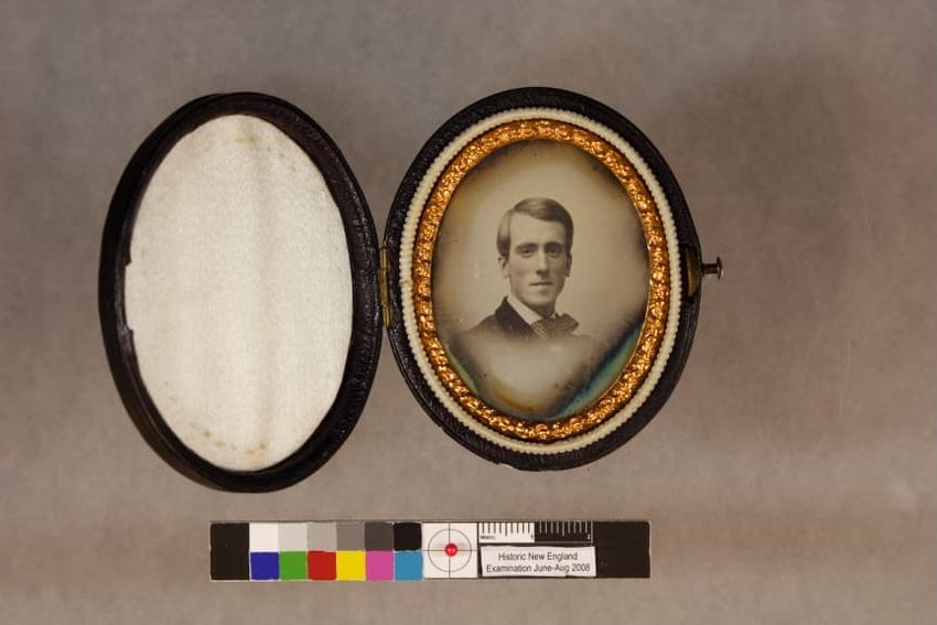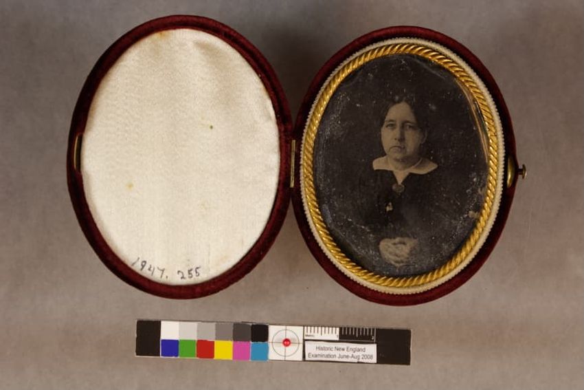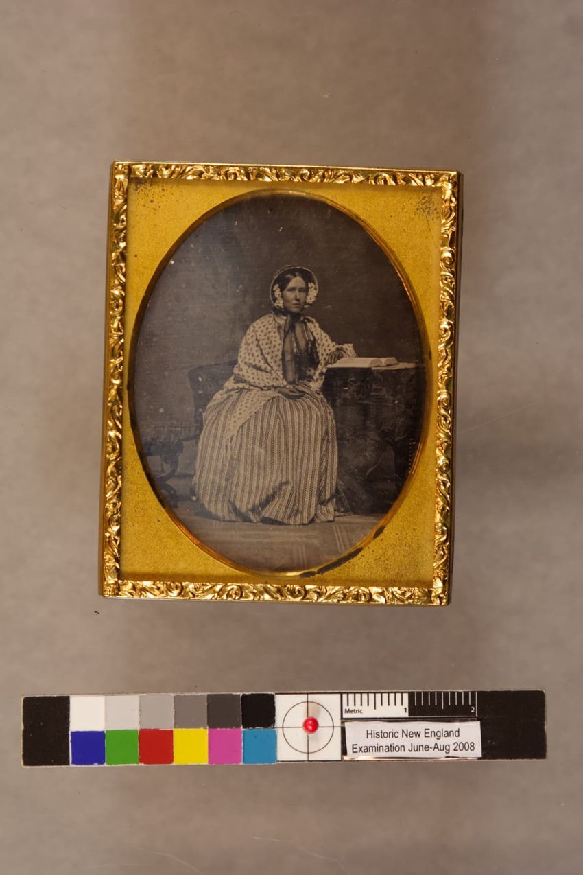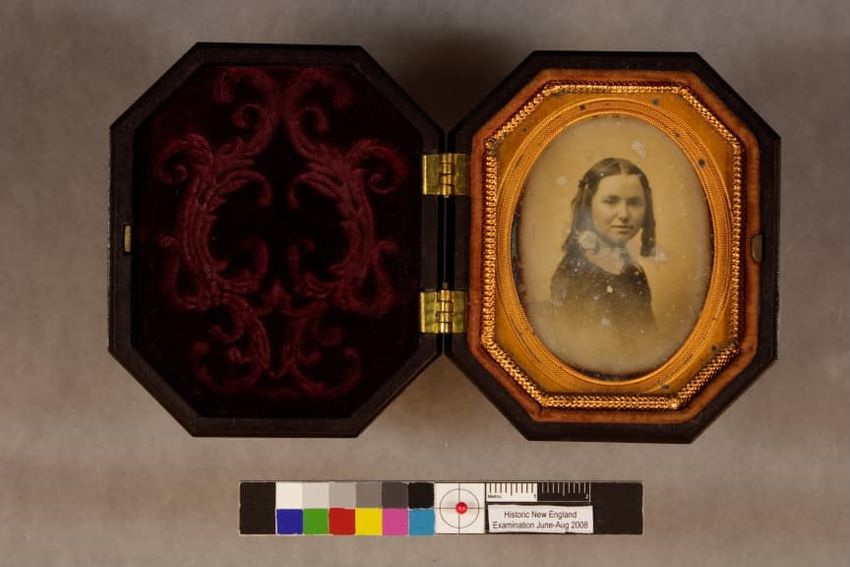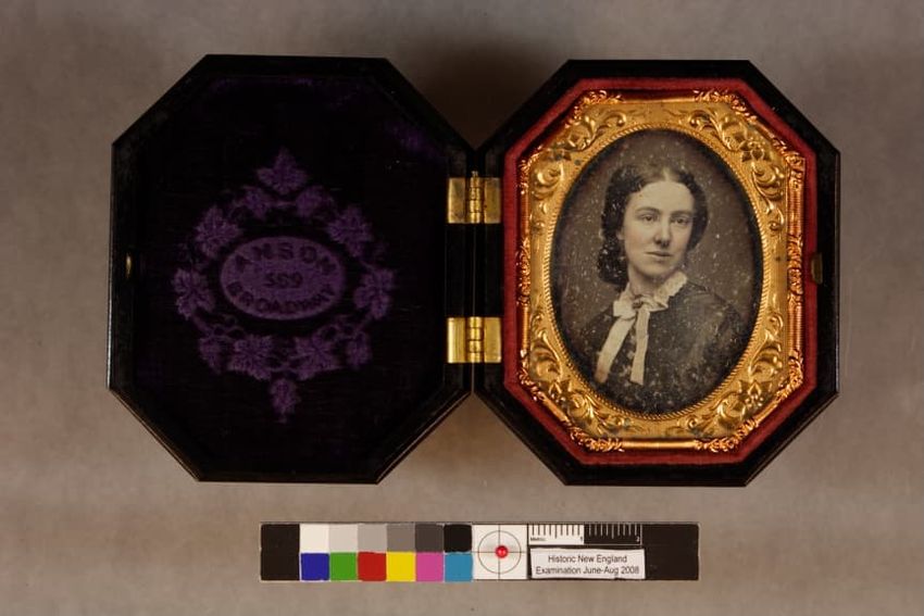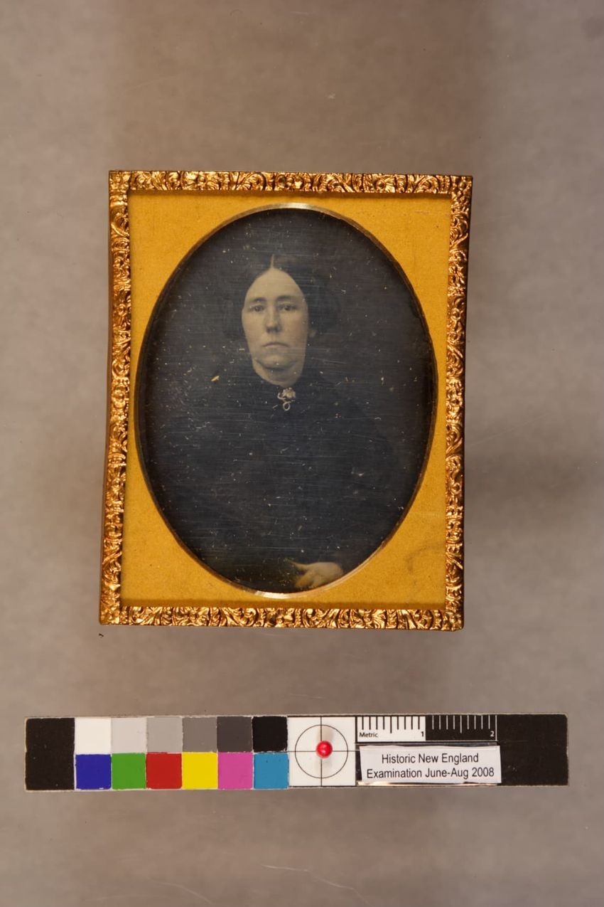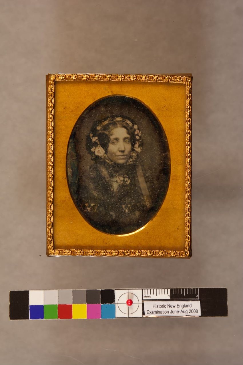 Young woman wearing a décolleté dress and necklace. Walter B. Eastman, proprietor of John Plumbe's Boston franchise, took over the studio soon after this image was taken.
