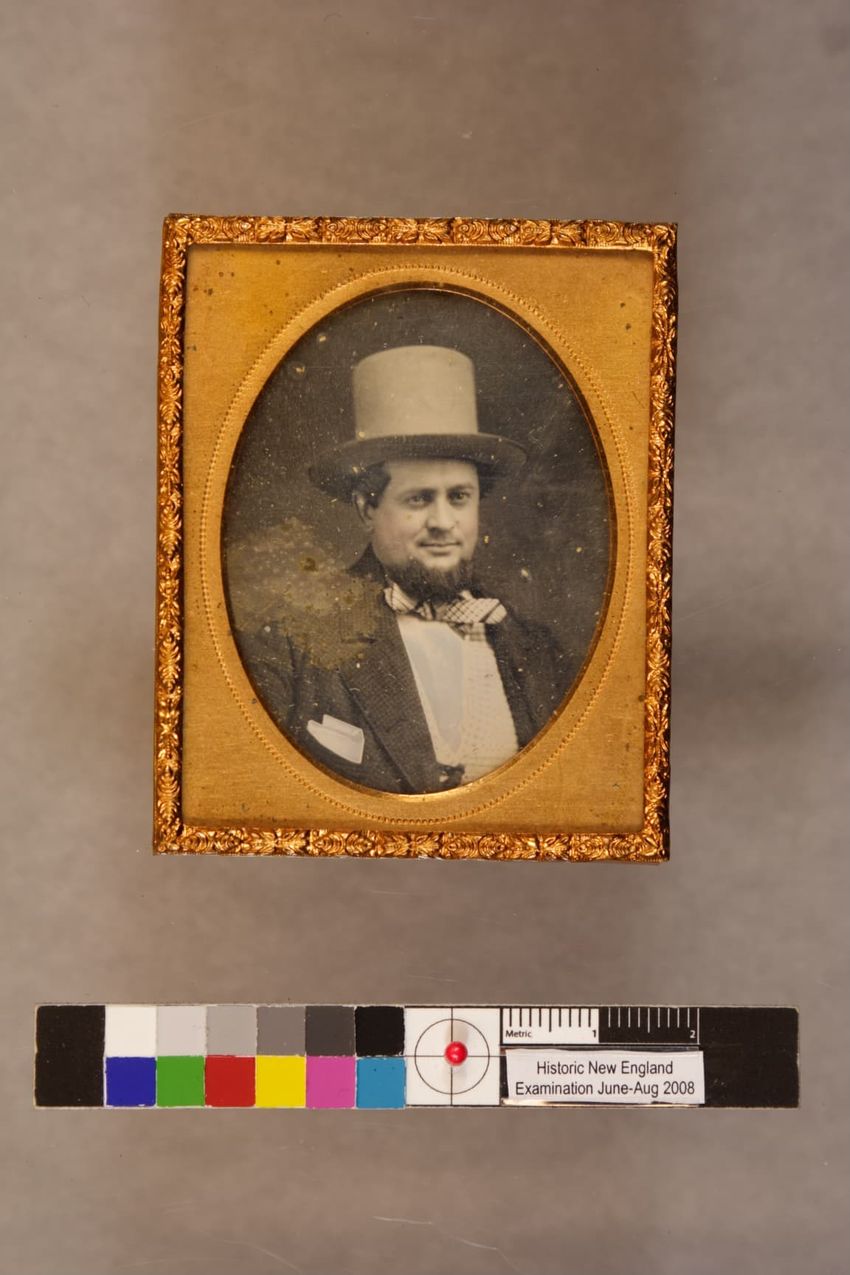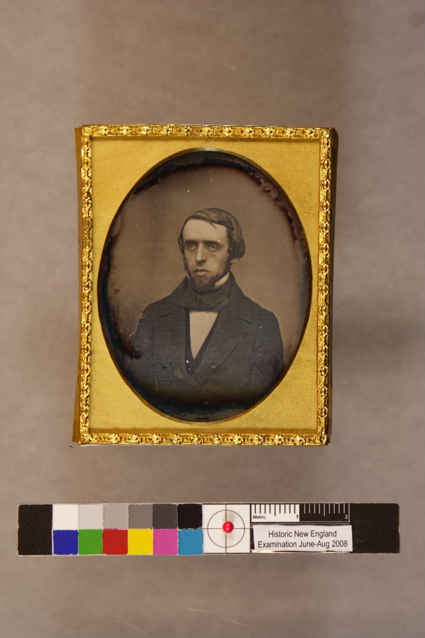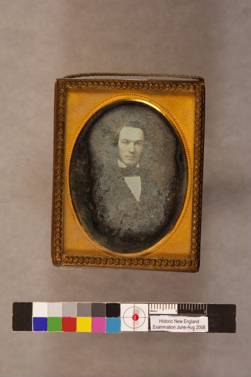Man in his twenties with bushy beard. The portrait is set into mother-of-pearl inlay. In same case as D.9.040.