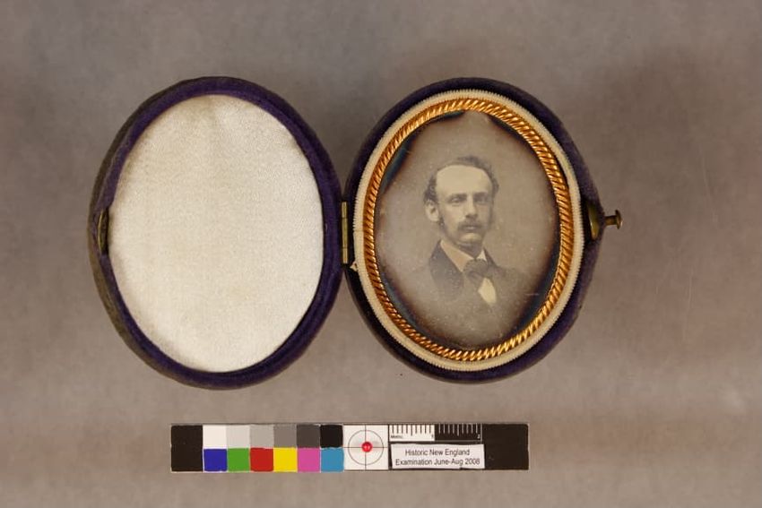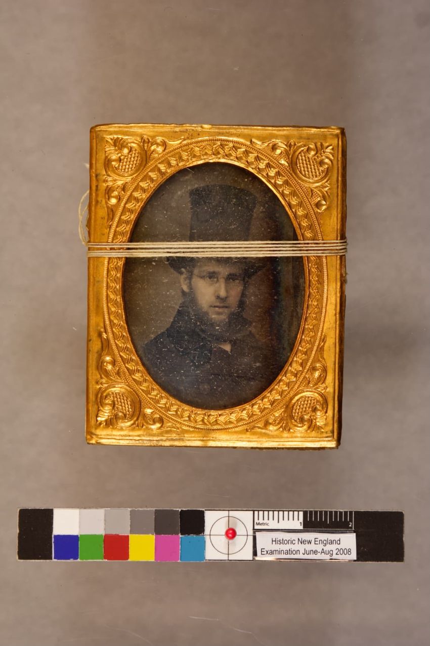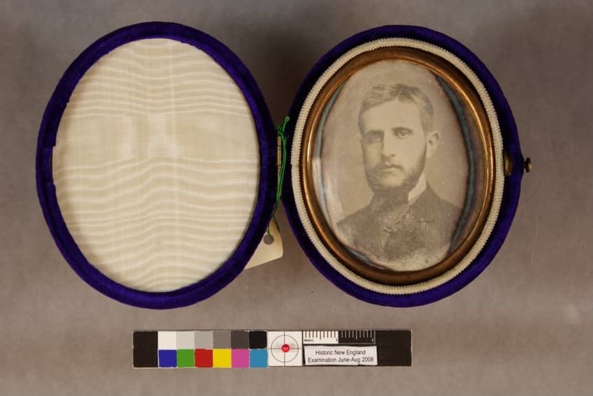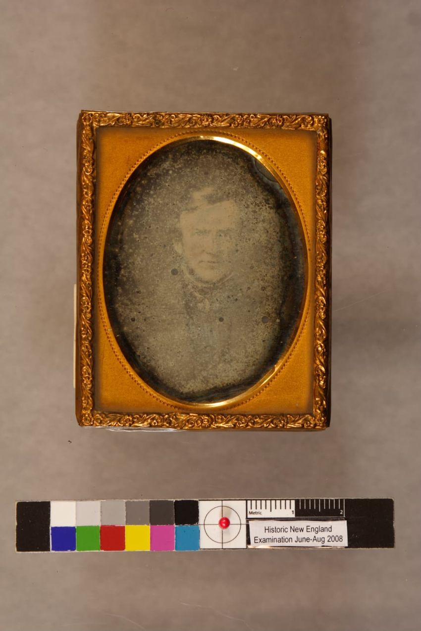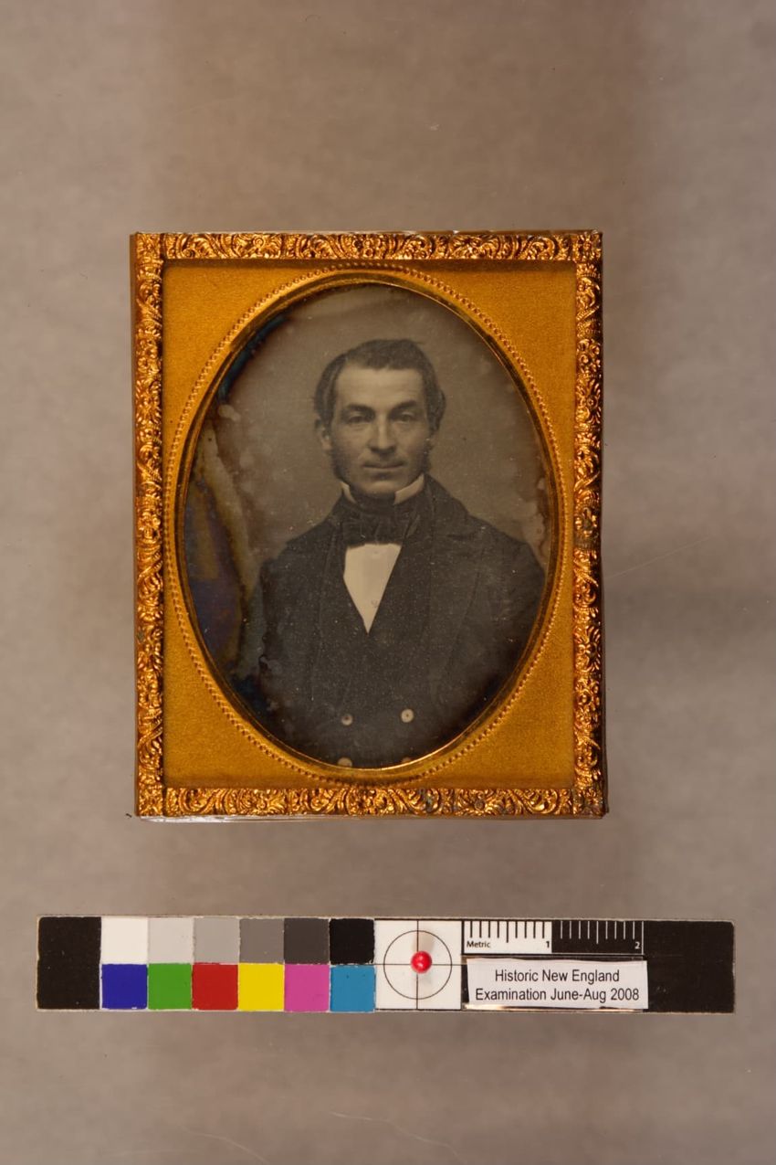 Man in his twenties with bushy beard. The portrait is set into mother-of-pearl inlay. In same case as D.9.040.
