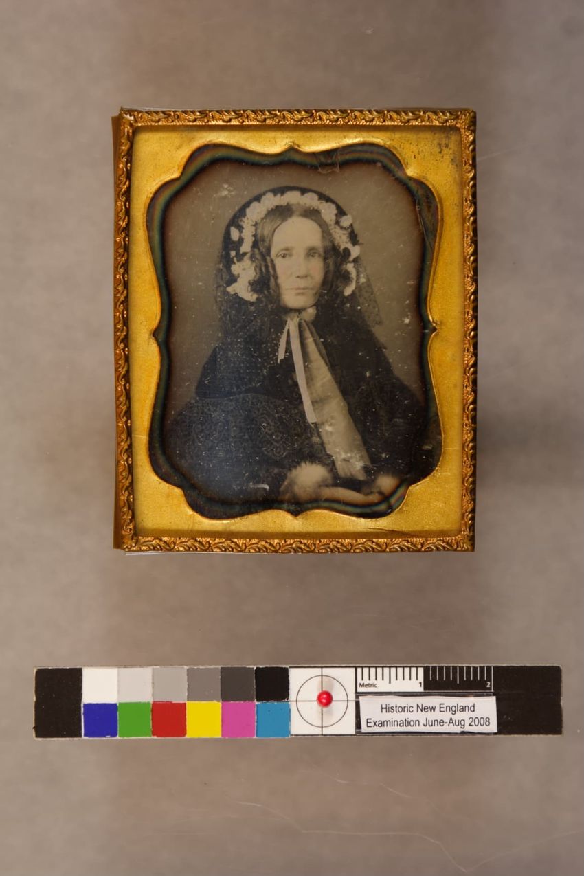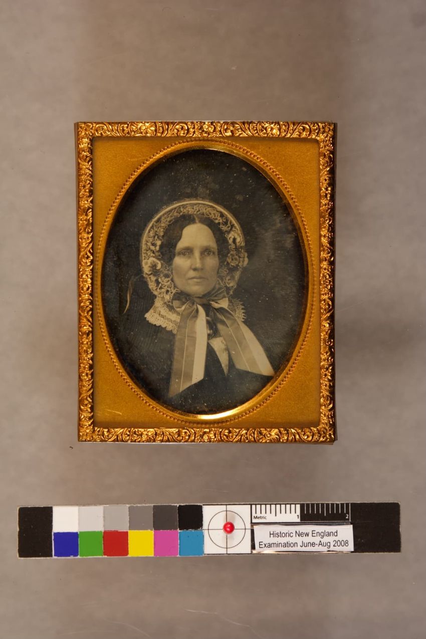 Mary Munroe Curtis, 1814-69, later Mrs. William Willson, wearing elaborate hairstyle, bonnet and outwear. Gift of Mrs. W.O. Ross.
