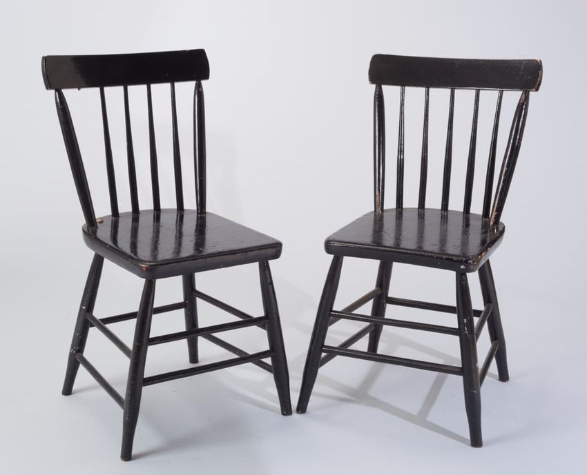 One of a pair of Windsor side chairs painted black with a plank seat, rounded tablet crest, five spindles, and seven stretchers.