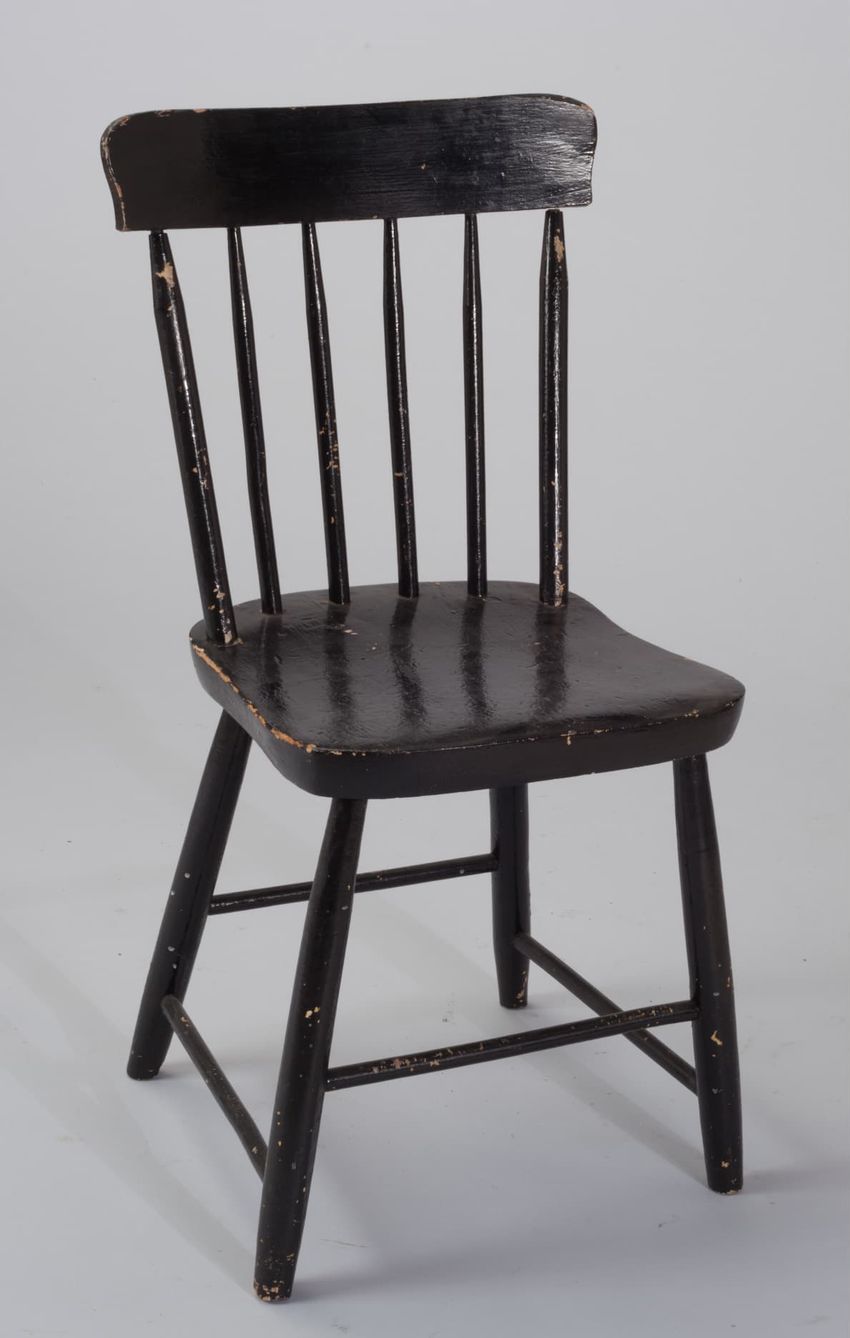 Windsor side chair painted black with a rounded tablet crest, shaped plank seat, and four plain turned legs.