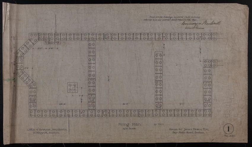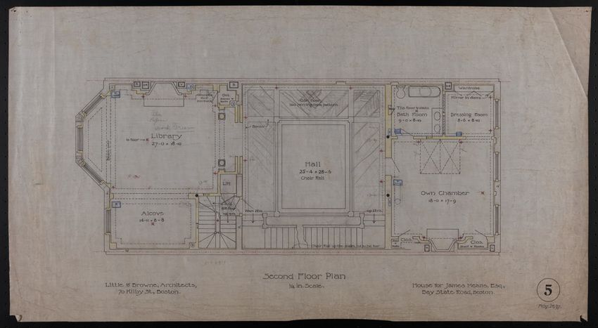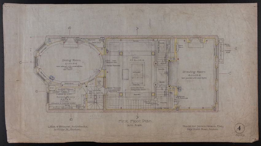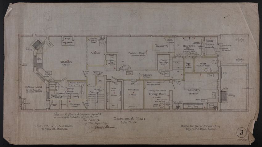 Drawings for an original Colonial revival townhouse for James Means at 191 Bay State Road in Boston.