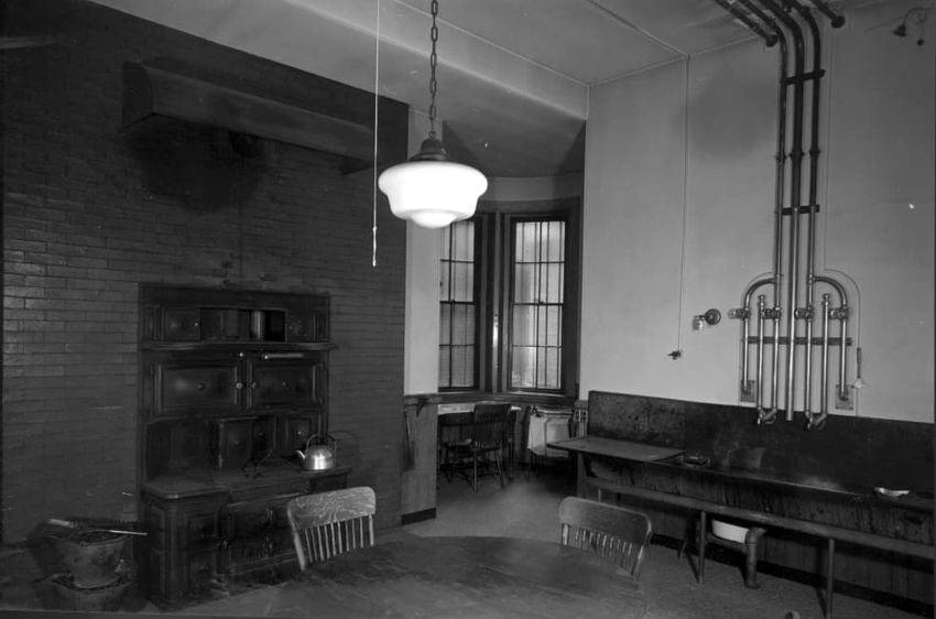 Interior photograph of the first floor dining room in 59 Mount Vernon St., Boston, Mass. The view through the dining room shows a woman seated at a desk- Eleanor Little Aldrich?