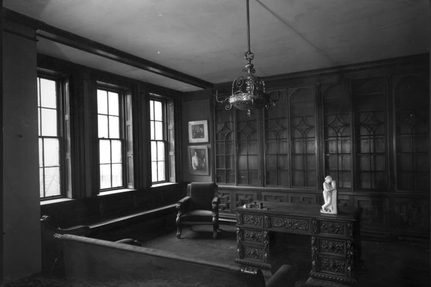 Interior photograph of the second floor library in 59 Mount Vernon St., Boston, Mass.