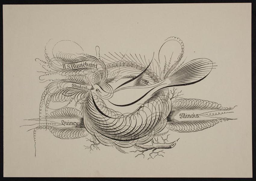 The bird holds a banner with the text "H.S. Blanchard, Student, Quincy, Illinois." This is one drawing within a group of nine drawings.