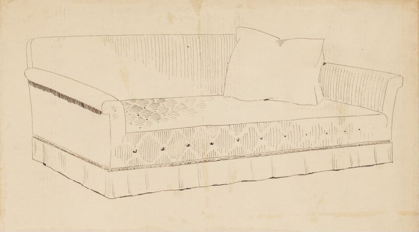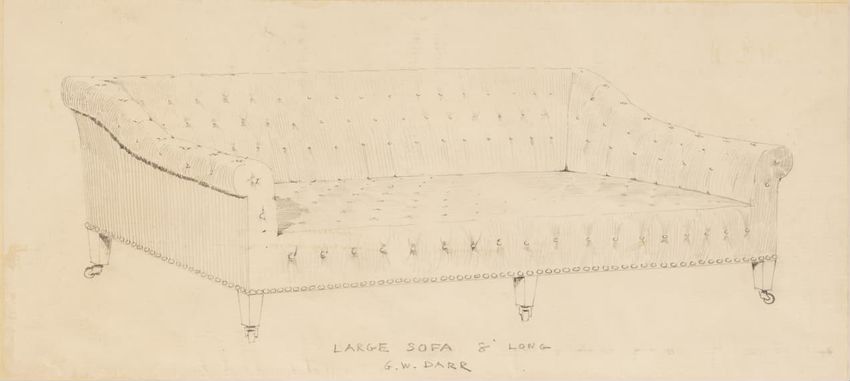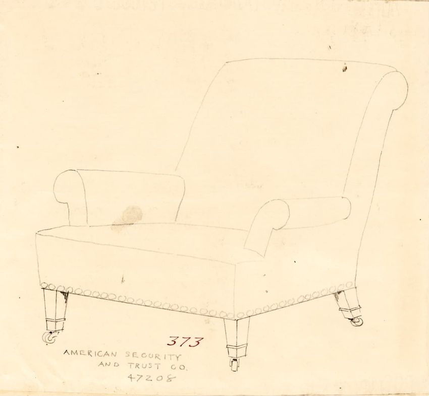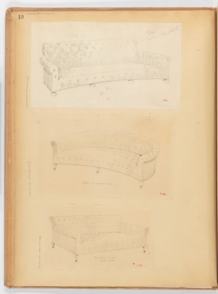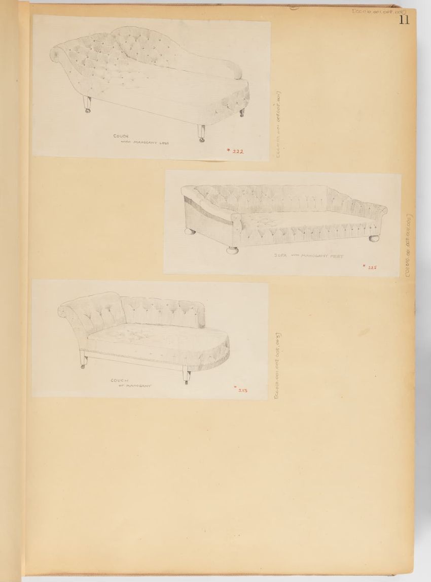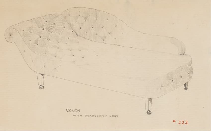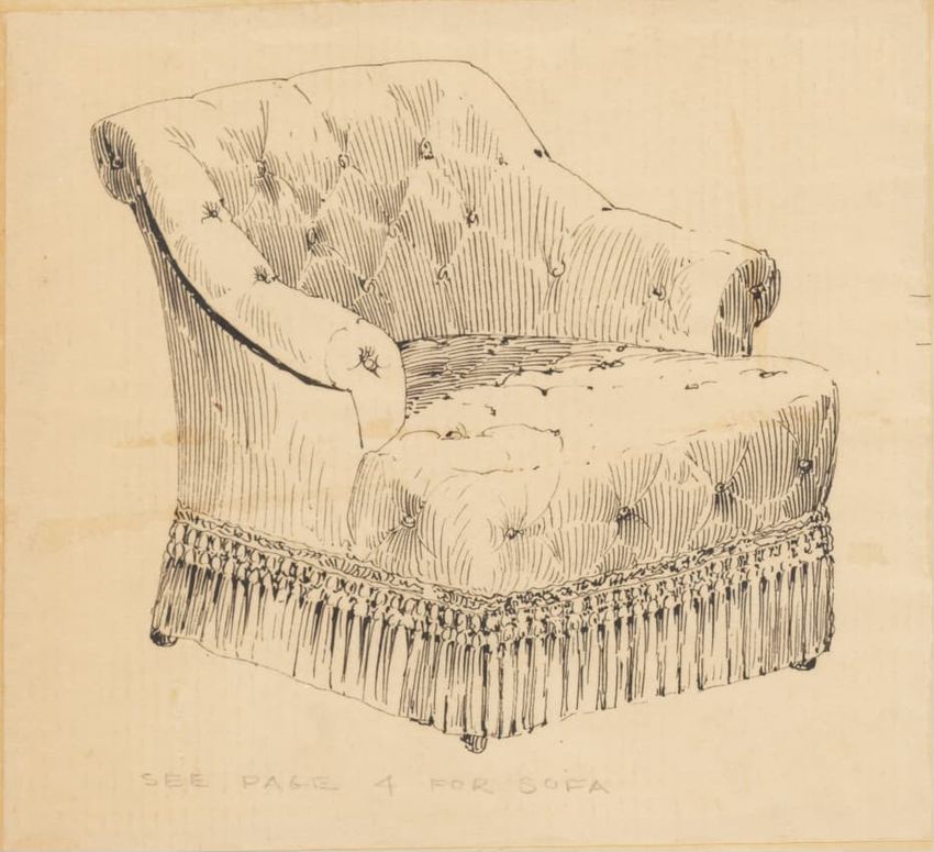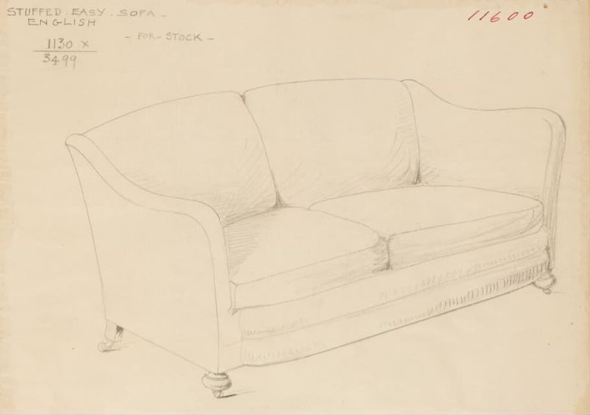 Untitled design drawing of a sofa rendered in pencil on trace. Perspective view is shown. Large upholstered sofa has rectangular back; rounded arms; tufting on back, arm and seat upholstery; single row of metal tack trim along bottom edge of upholstery; and bun feet. Title, design notes, "45122 / De...