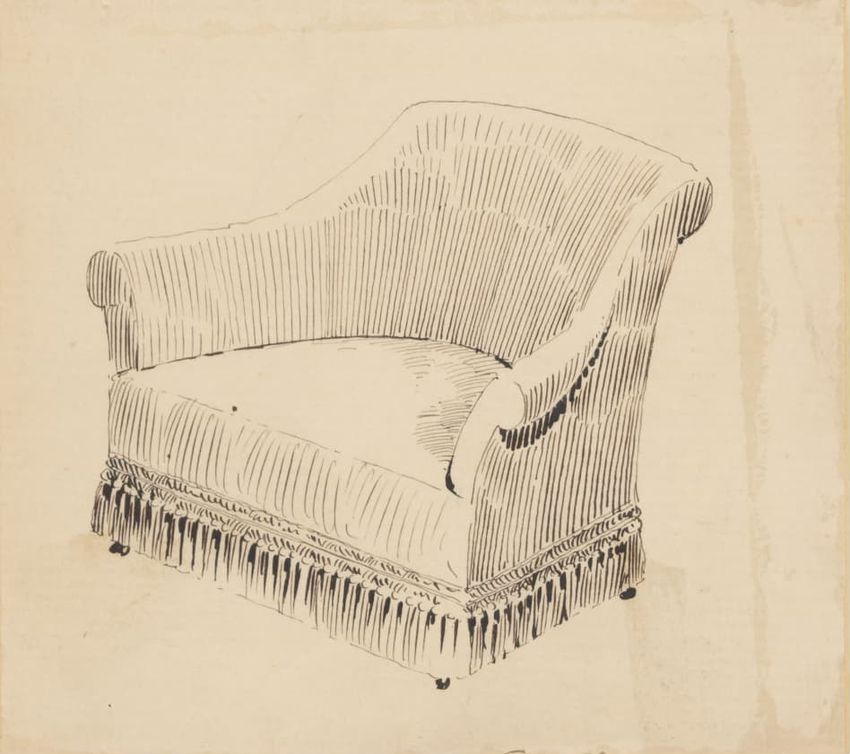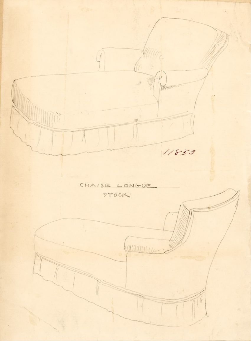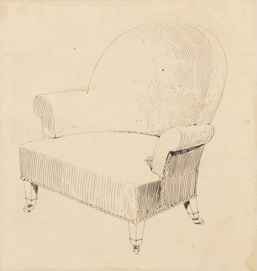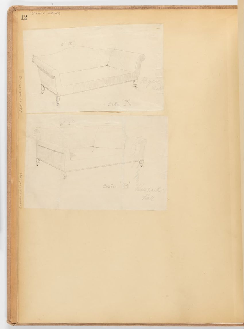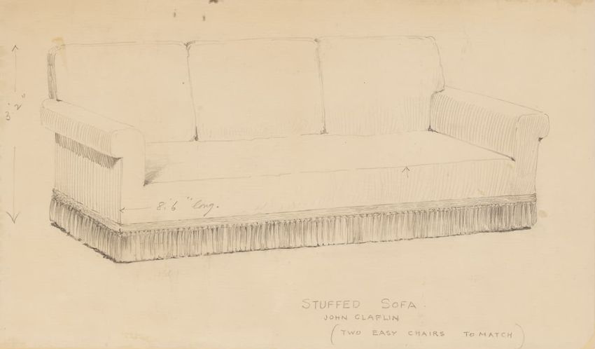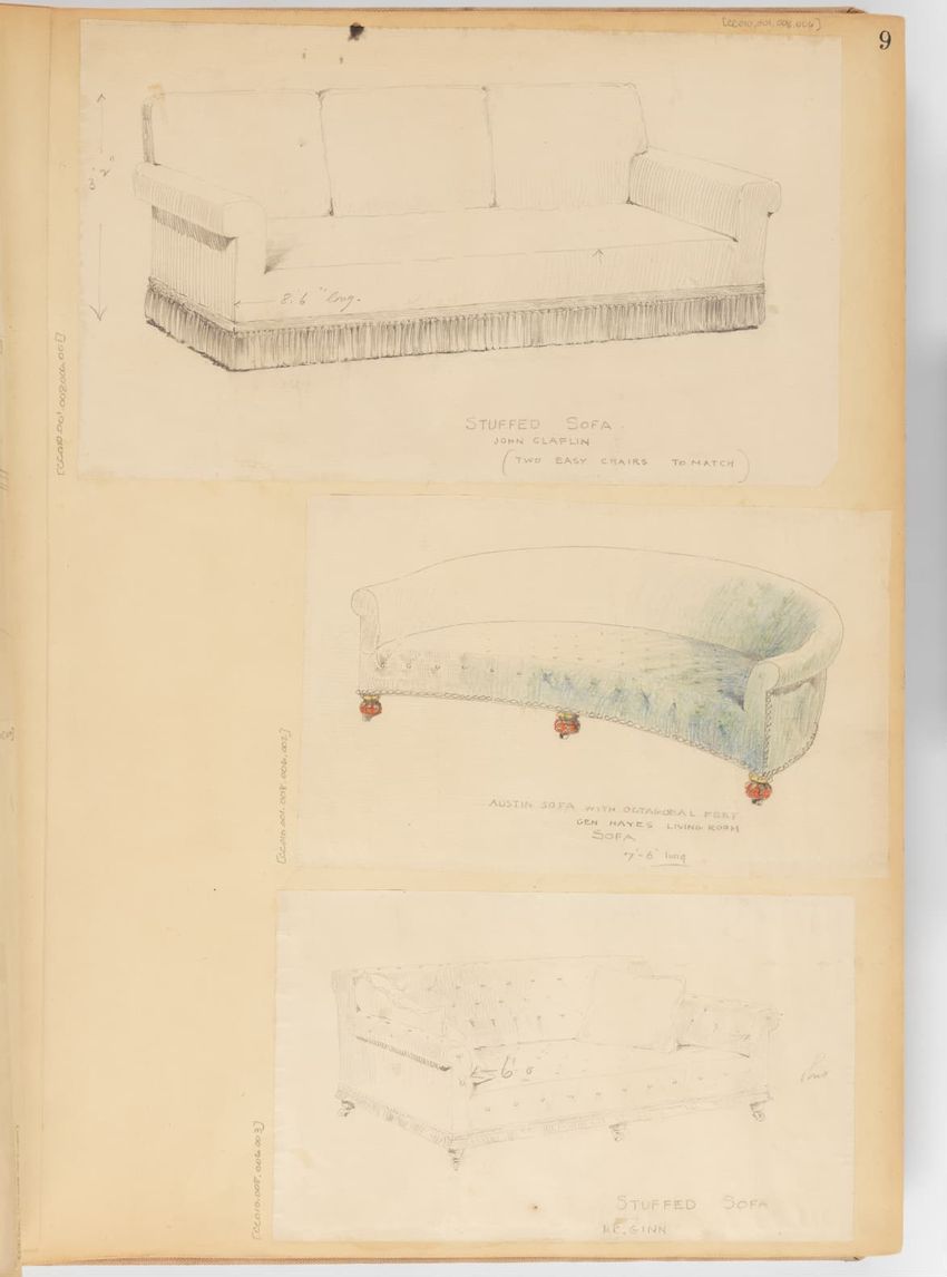 Untitled design drawing of a sofa rendered in pencil on trace. Perspective view is shown. Large upholstered sofa has rectangular back; rounded arms; tufting on back, arm and seat upholstery; single row of metal tack trim along bottom edge of upholstery; and bun feet. Title, design notes, "45122 / De...