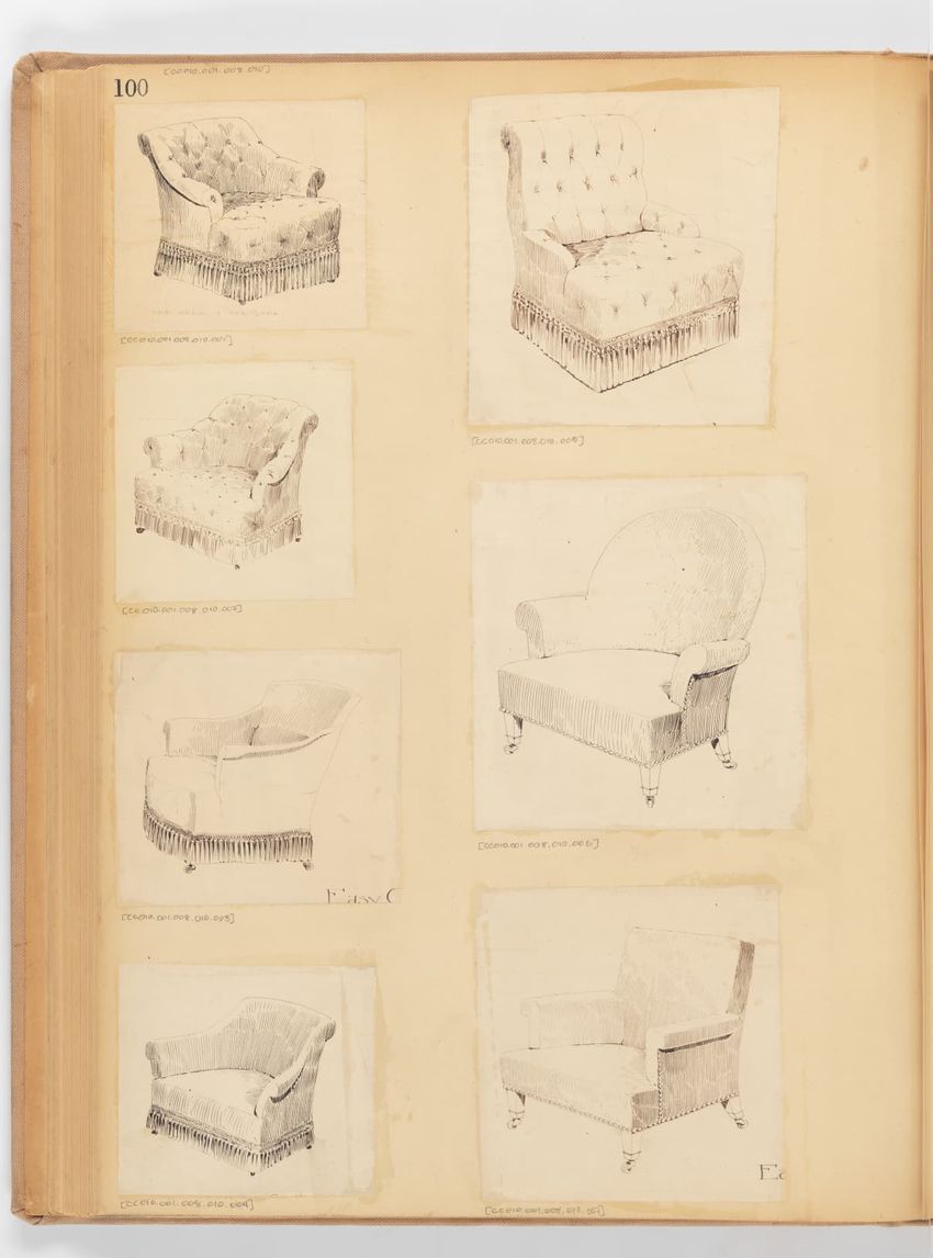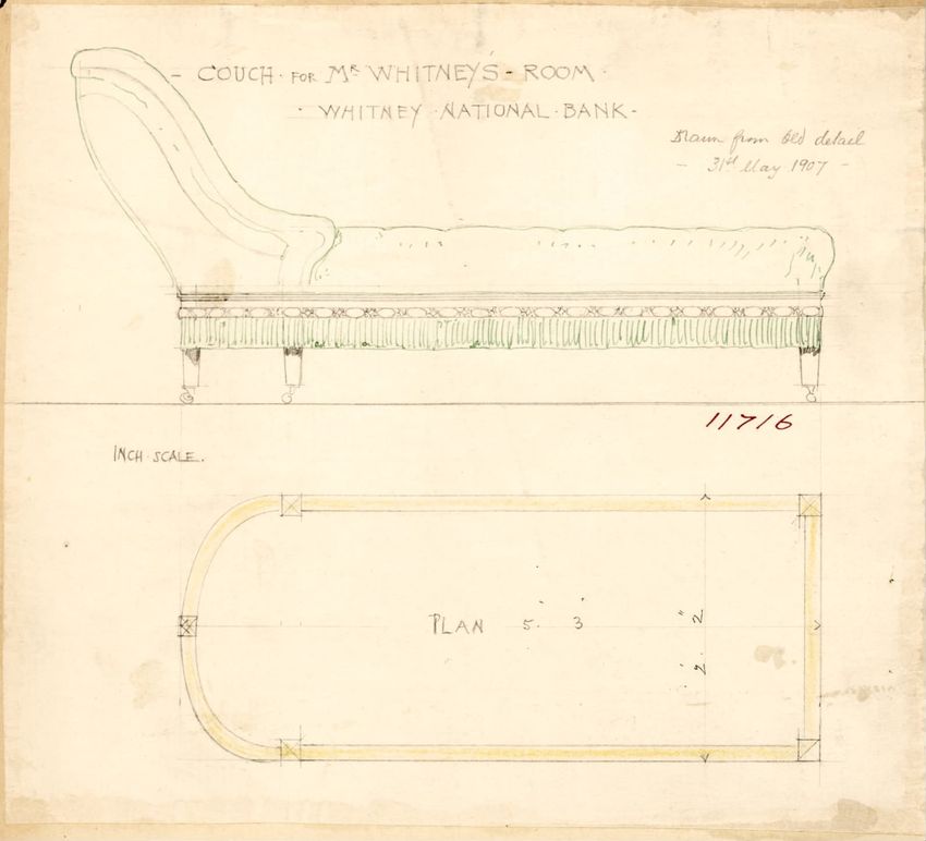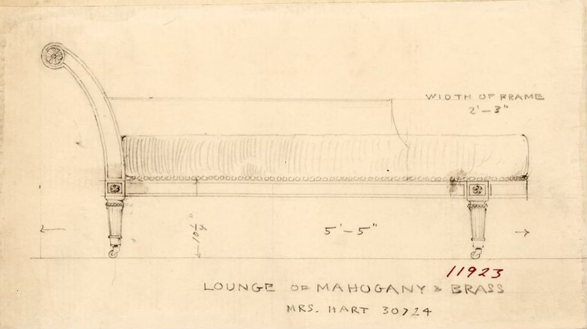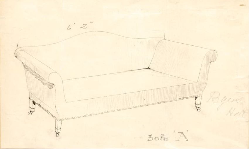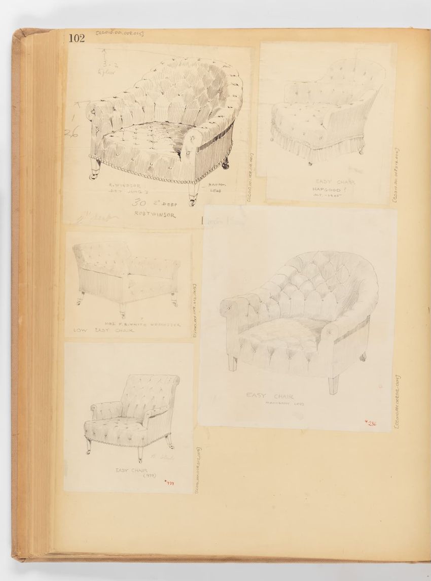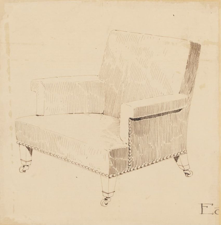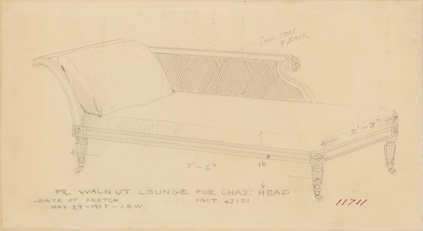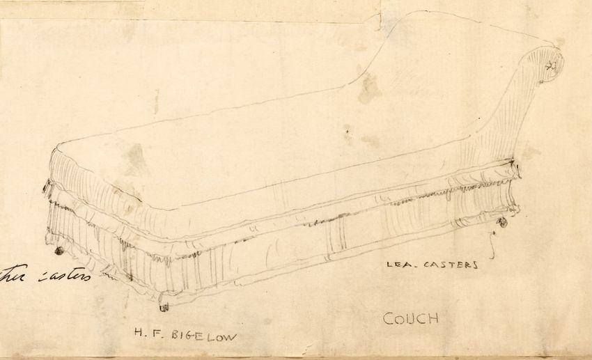 Untitled design drawing of a sofa rendered in pencil on trace. Perspective view is shown. Large upholstered sofa has rectangular back; rounded arms; tufting on back, arm and seat upholstery; single row of metal tack trim along bottom edge of upholstery; and bun feet. Title, design notes, "45122 / De...
