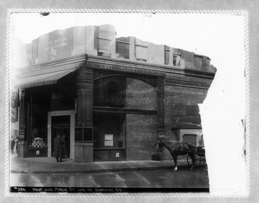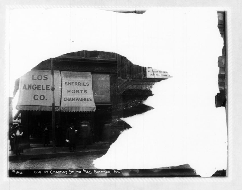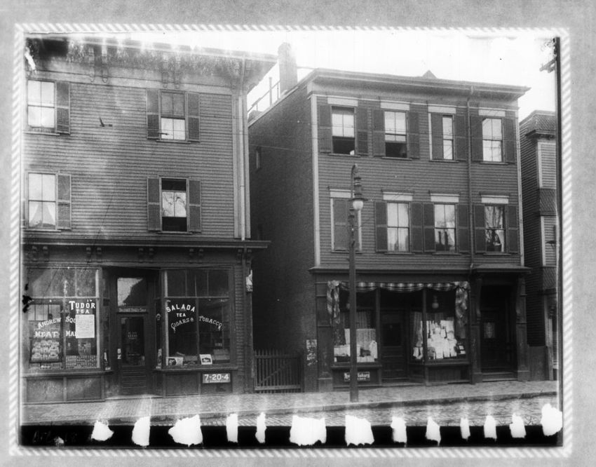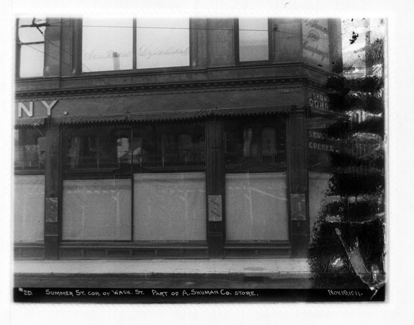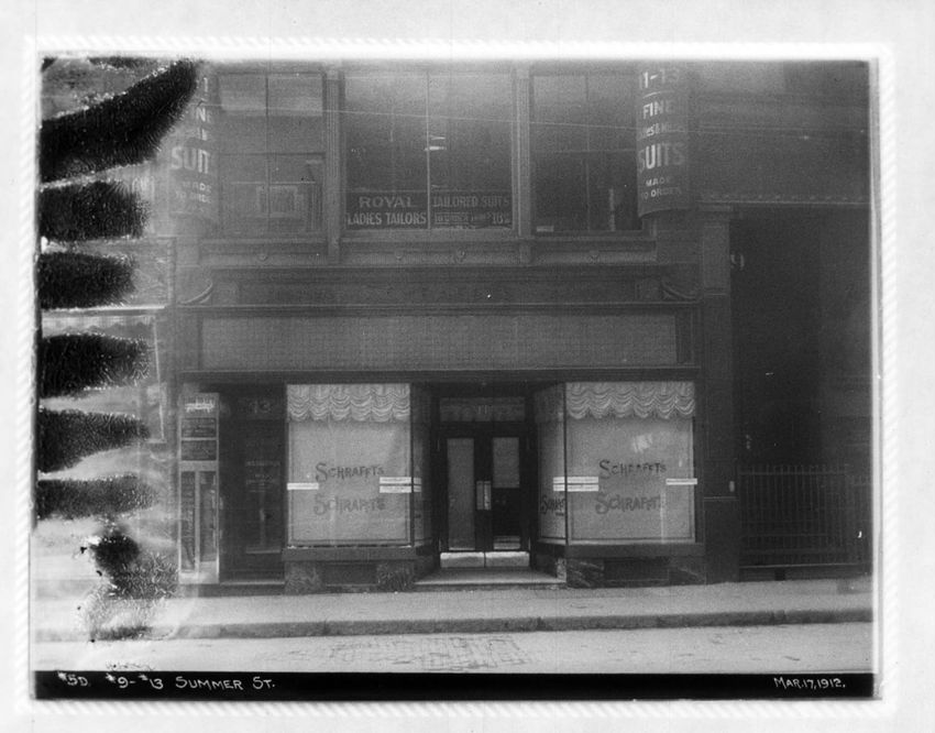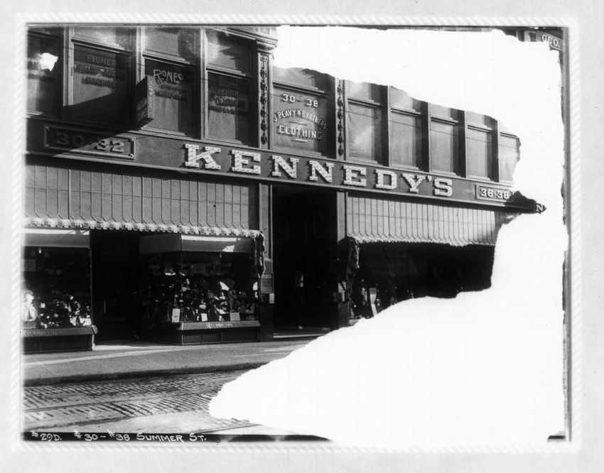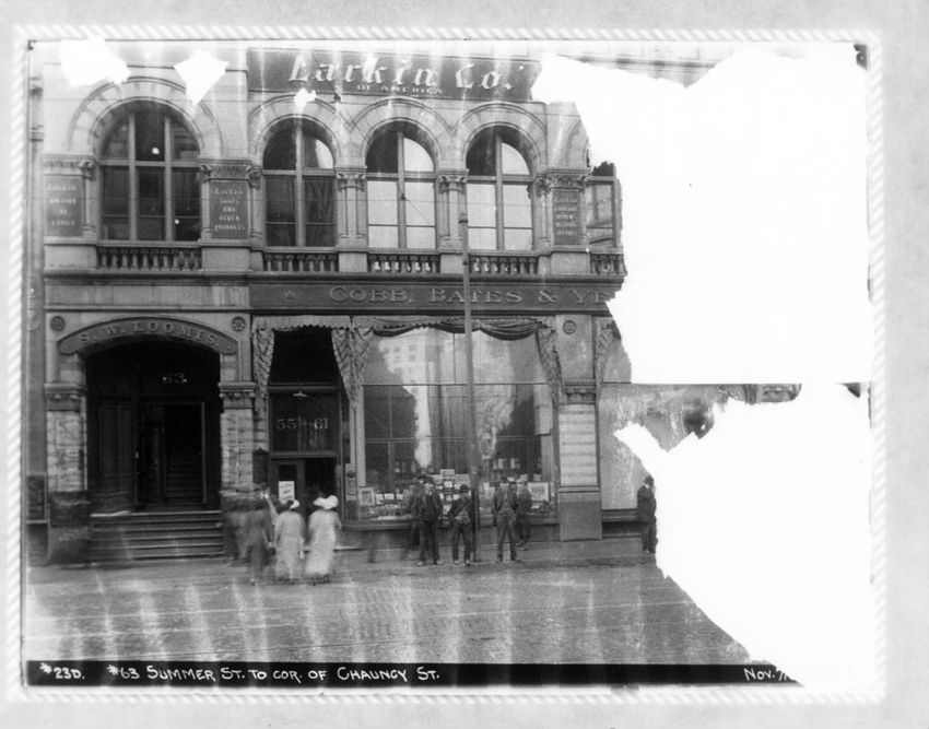 Pedestrians are in front of Cobb, Bates & Yerxa, groceries, at 55-61 Summer Street. S.W. Loomis, clothing, is to left at 63 Summer. The Larkin Company, soap and other products, is on the second floor.